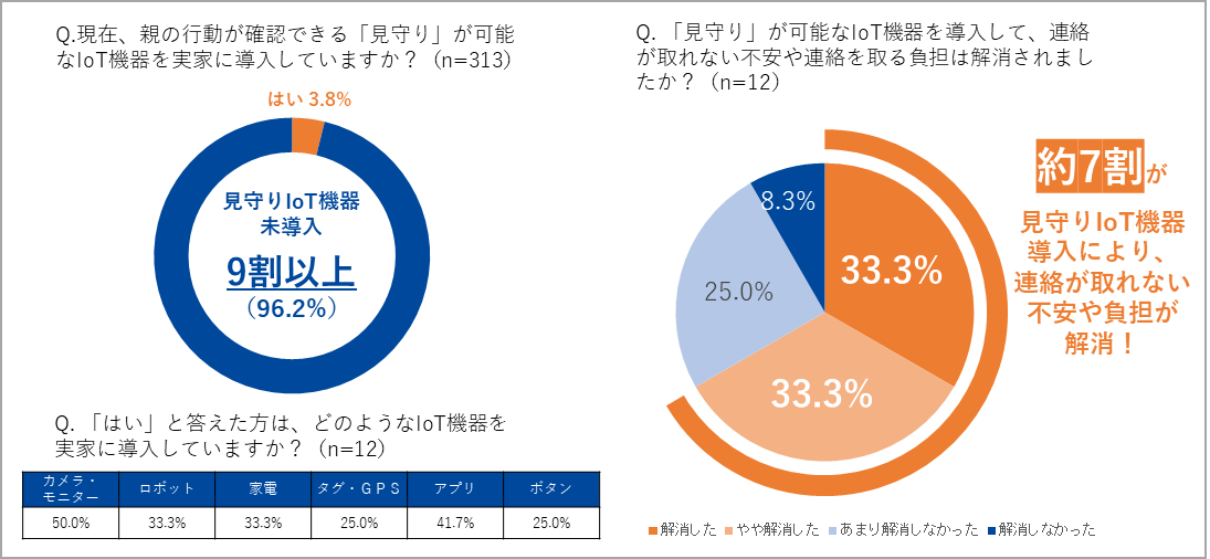 離れて暮らす親と会う頻度は「年1回かそれより少ない」方が23.0%と最多。見守り機能付きIoT機器を導入している約7割が「導入したことで連絡が取れない不安や負担が解消された」と回答。