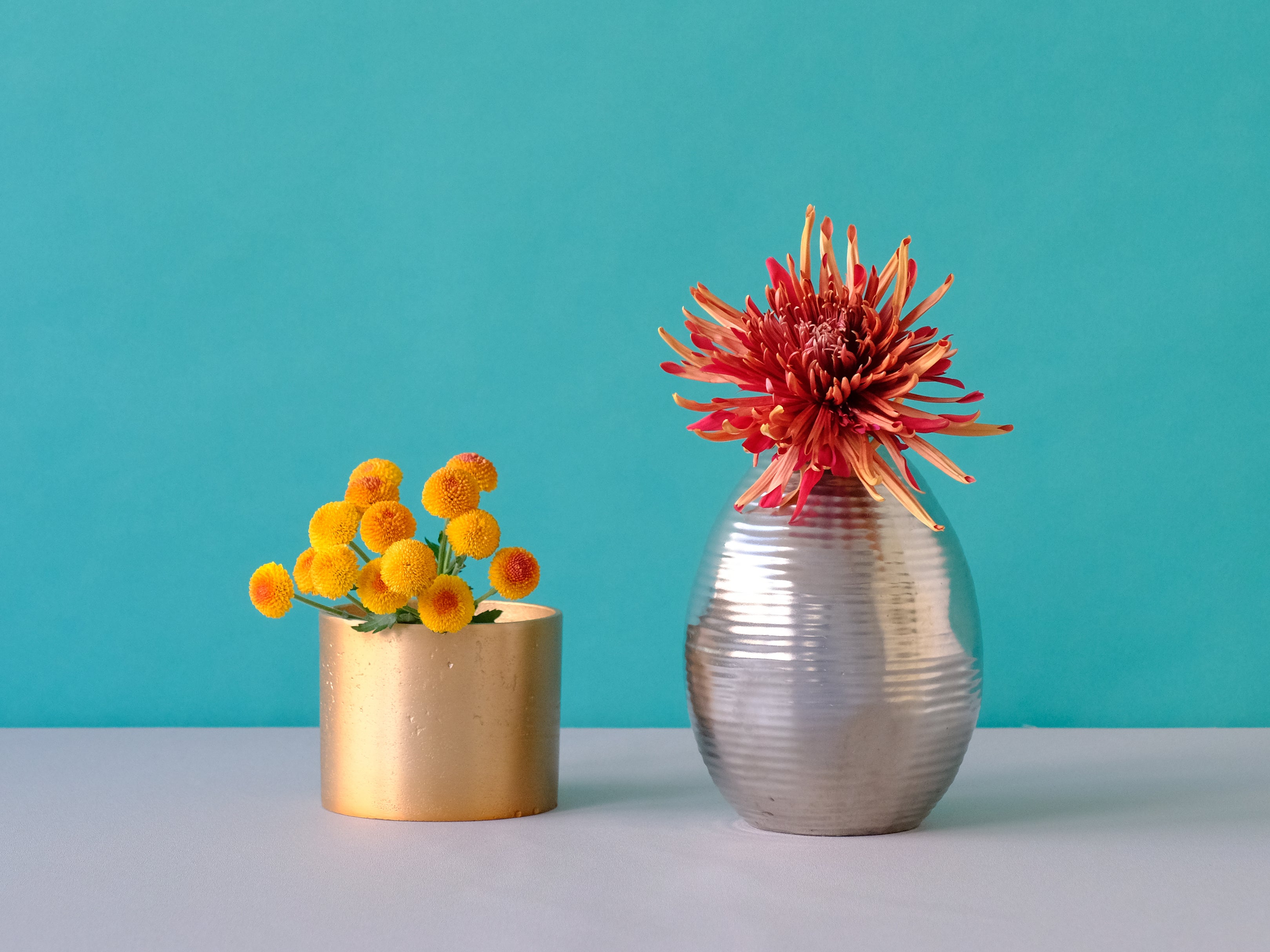 左下:枝分かれをして小さな花をたくさん咲かせるスプレータイプのマムと、一輪咲きのマムを並べてオブジェのように。あえて葉を取って花だけで飾るとスタイリッシュな仕上がりになります。