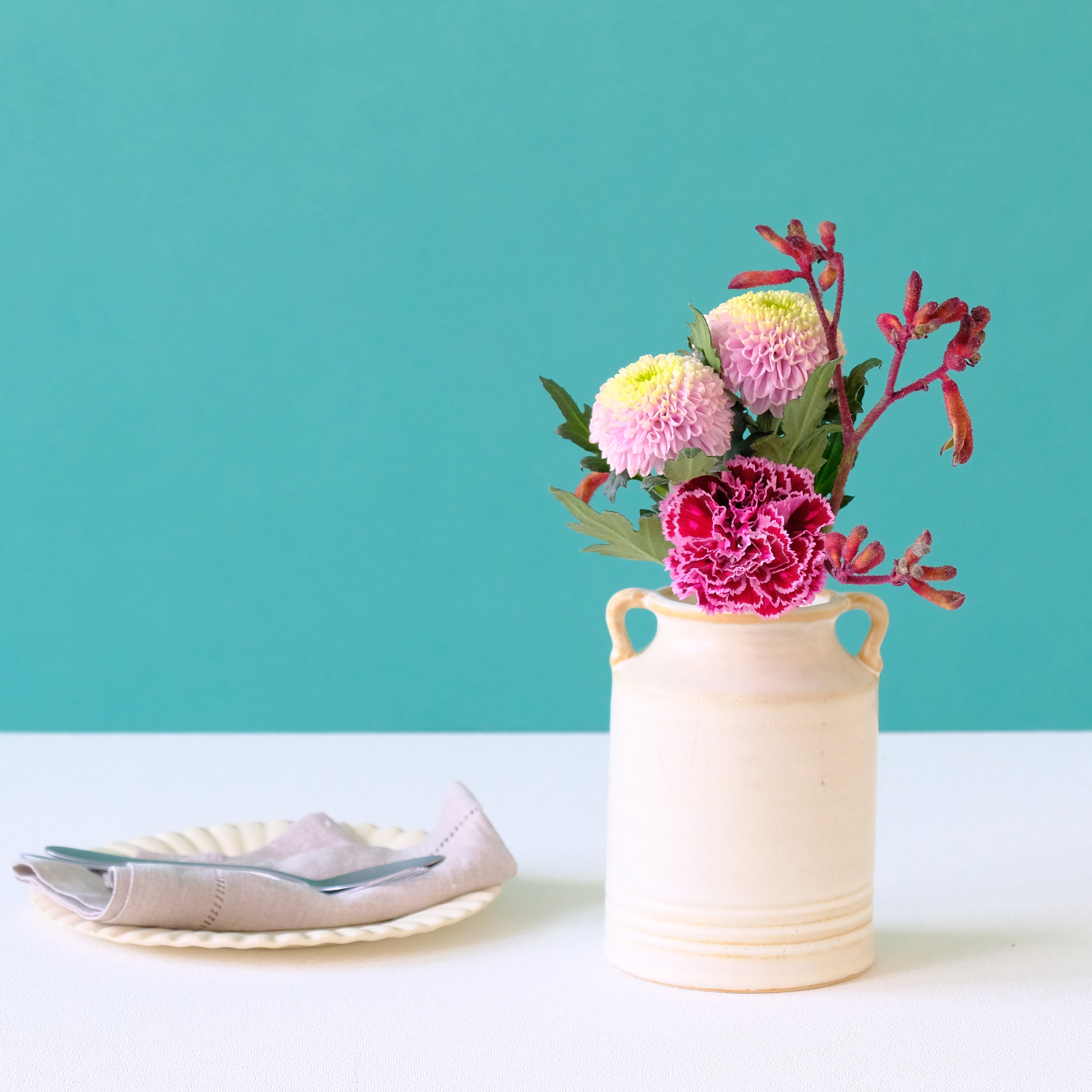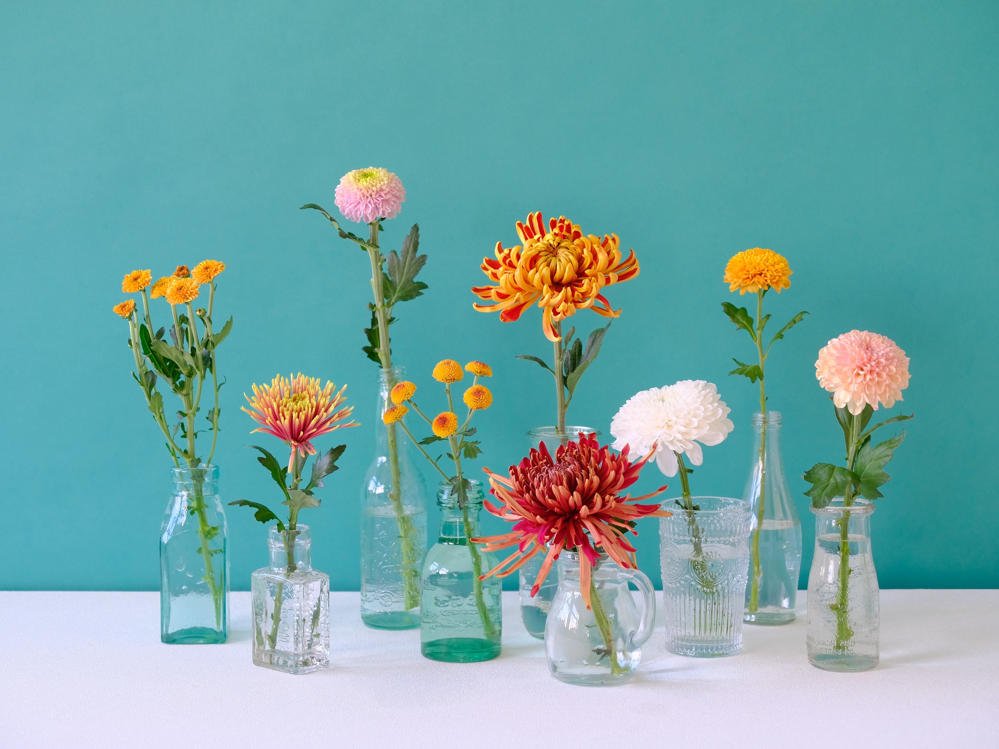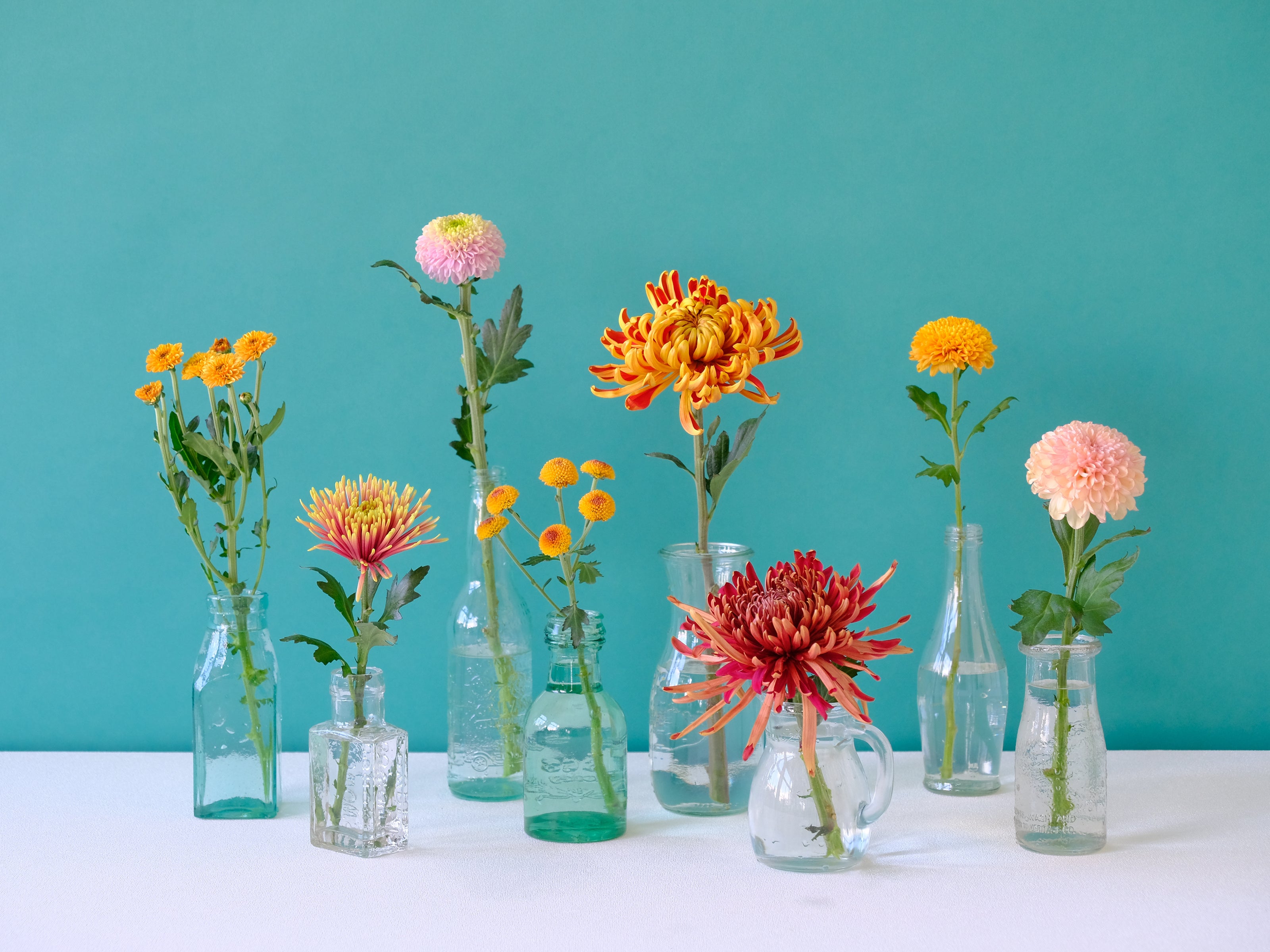 左上:様々な形のマムを一輪挿しにいけて並べてみました。お手持ちの空き瓶なども使ってカジュアルな印象に仕上げても素敵です。