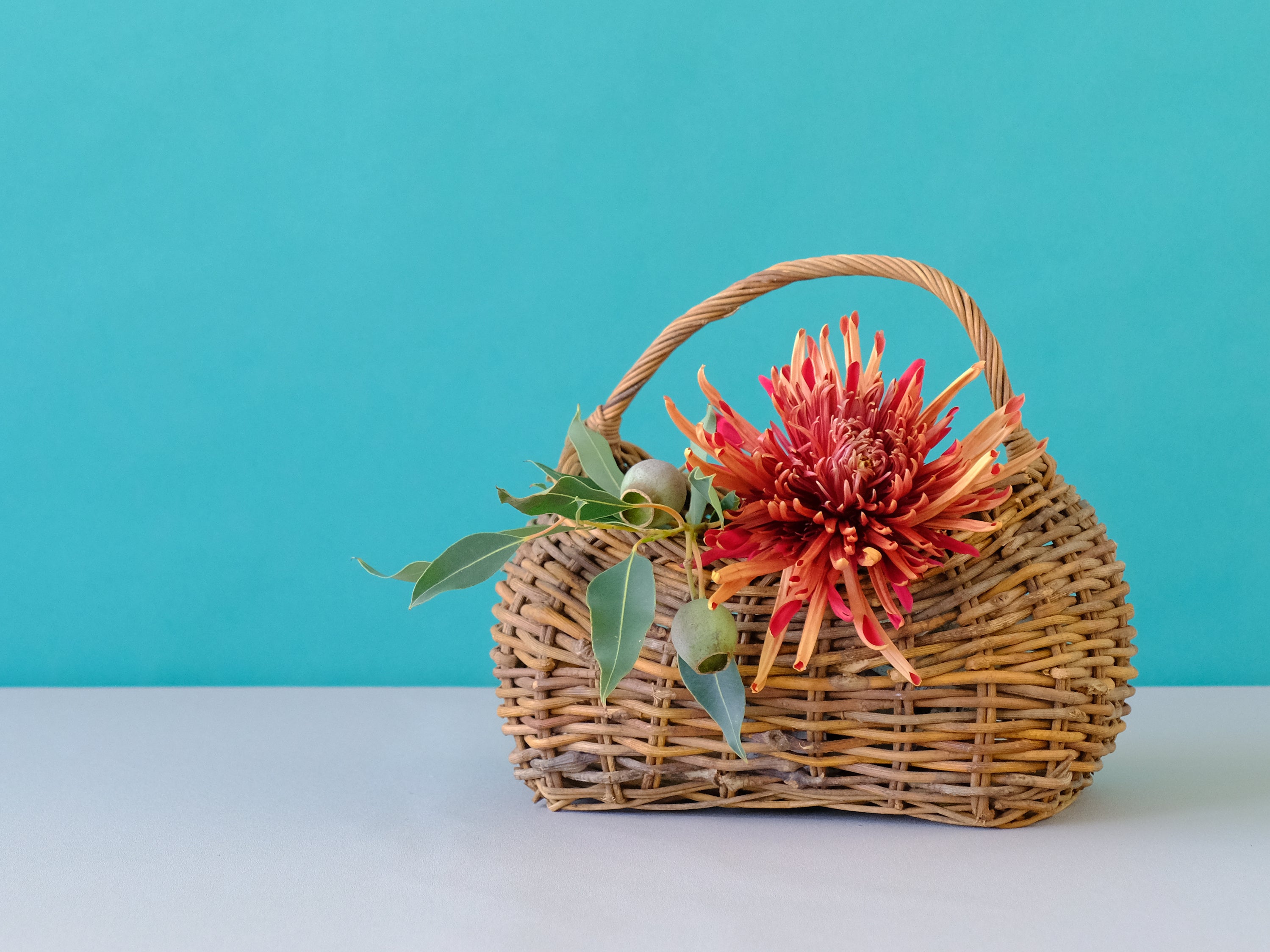 右上:コップなどに入れた花を手つきのかごにセットしたナチュラルなあしらい。お手入れで短くなってしまったり、折れてしまったりした時にもおすすめです。