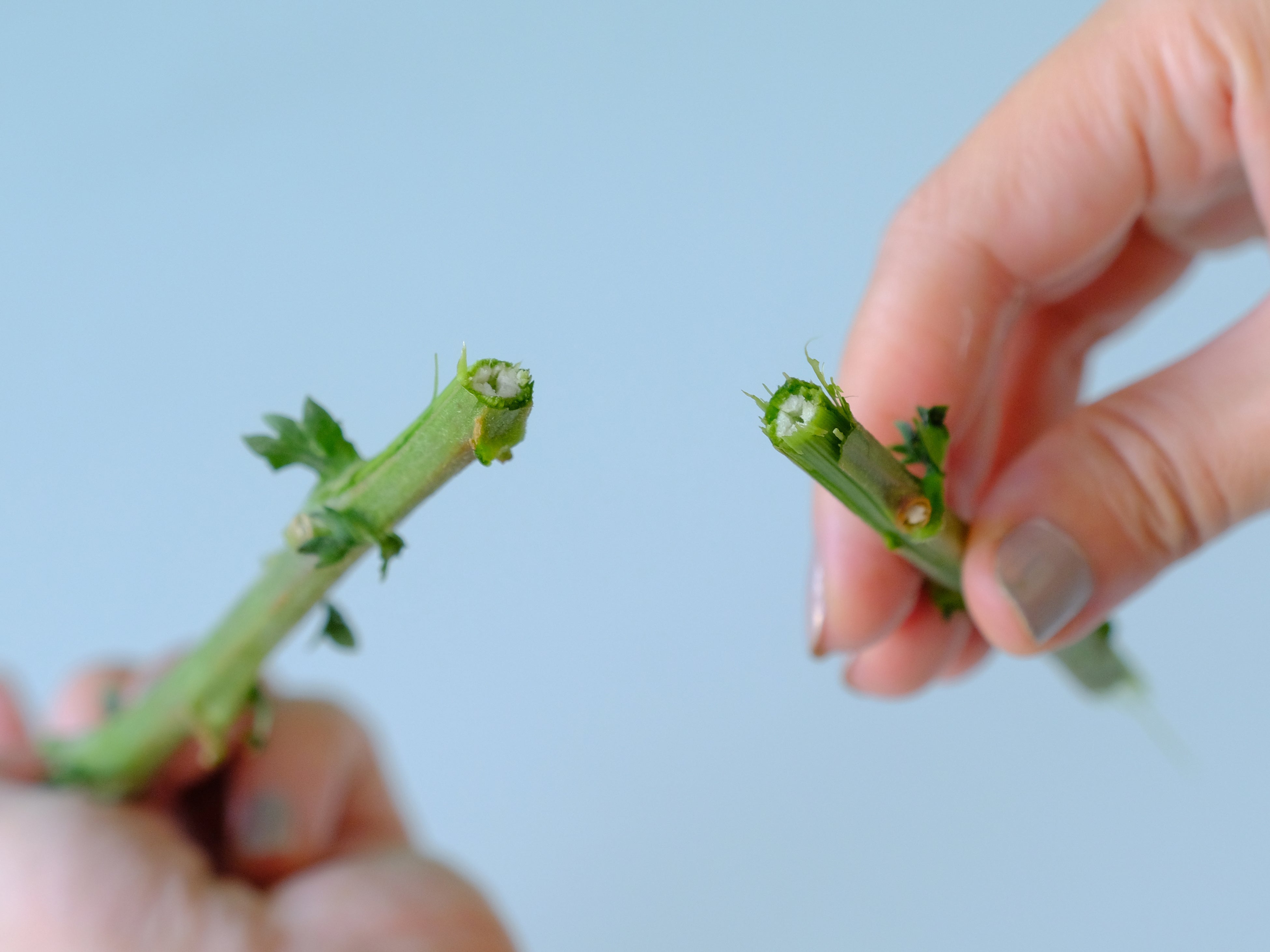 長持ちさせるポイントは、切り口を新しくして水を吸いやすくすることです。水替えの際にぜひ切り戻しを行ってみてください。菊は金属を嫌う植物と言われています。簡単に手で折れるのでハサミではなく手で折ってみてください。(難しければハサミで大丈夫です)