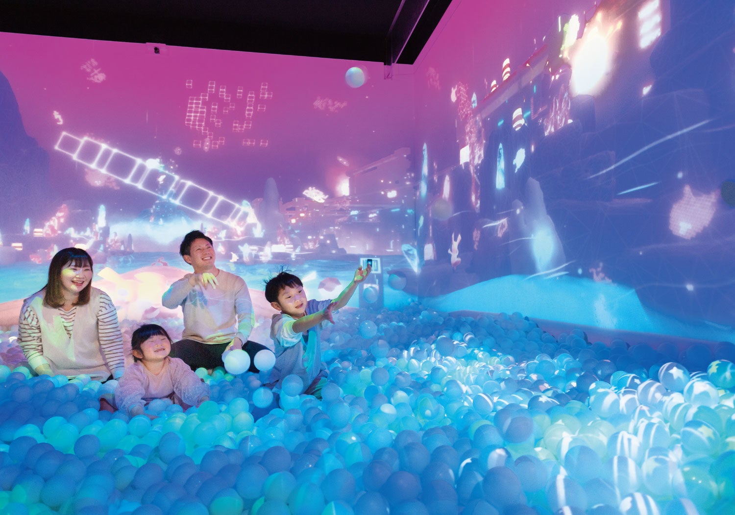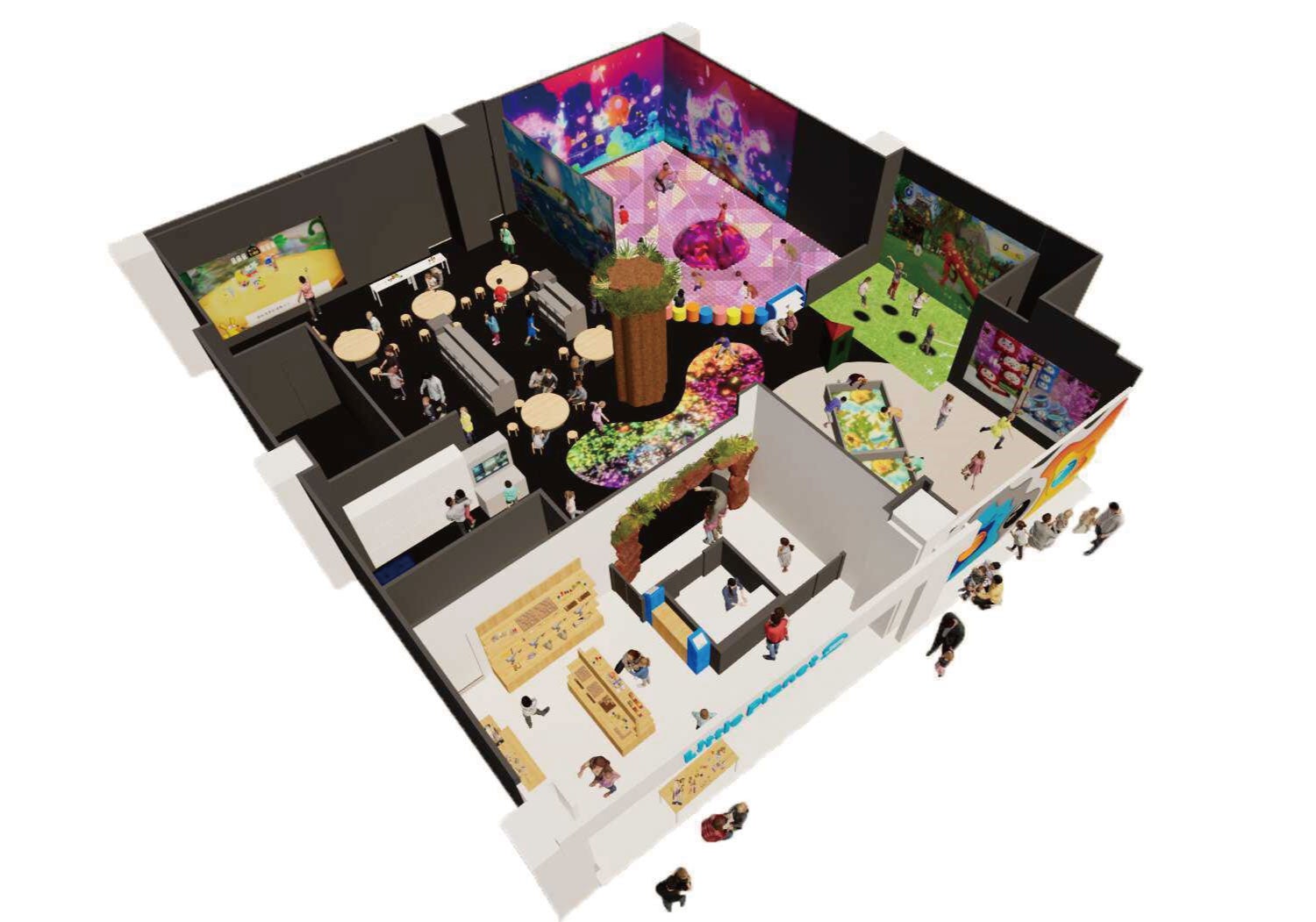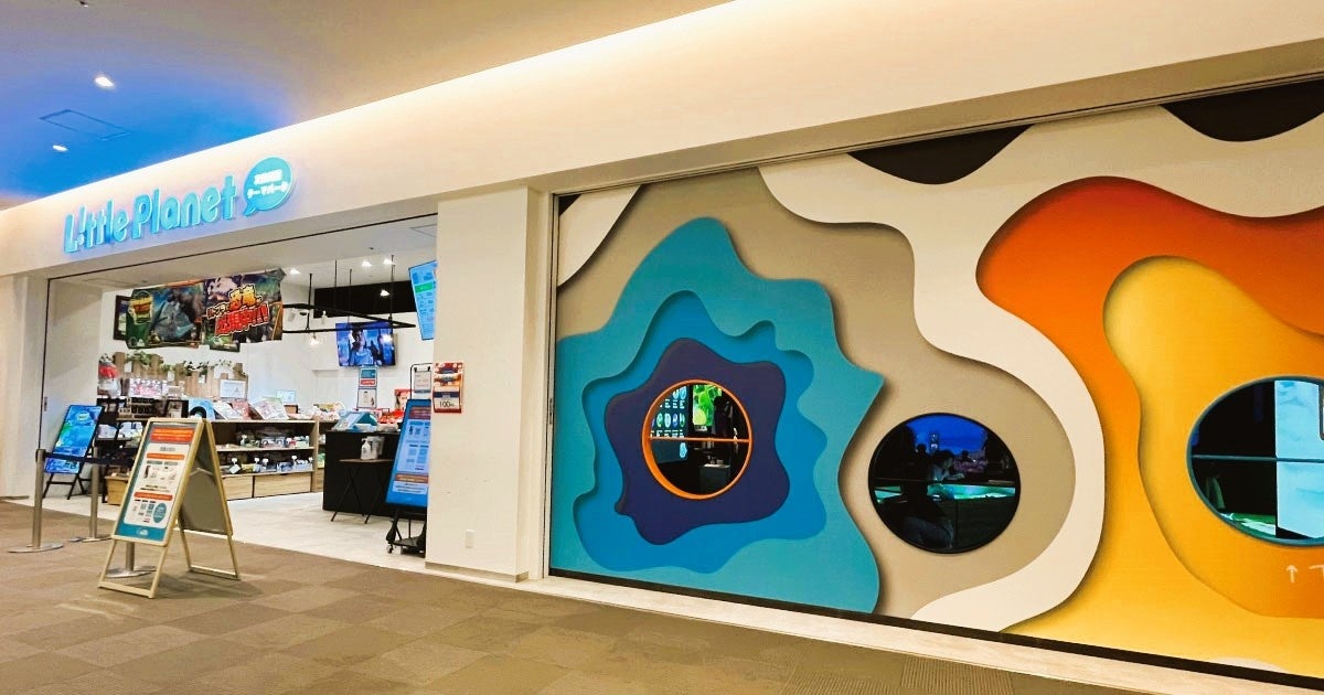 通路からパークの中を覗ける丸窓が開いた外壁には、通りすがる人々をリトルプラネットの不思議なデジタル空間へと誘うような幻想的なデザインを採用。エントランスには新たにセルフ受付ゲートを導入したほか、アトラクションの配置や併設のグッズショップも一新し、より快適に楽しく“未来のアソビ”が体験できるパークへと生まれ変わりました。