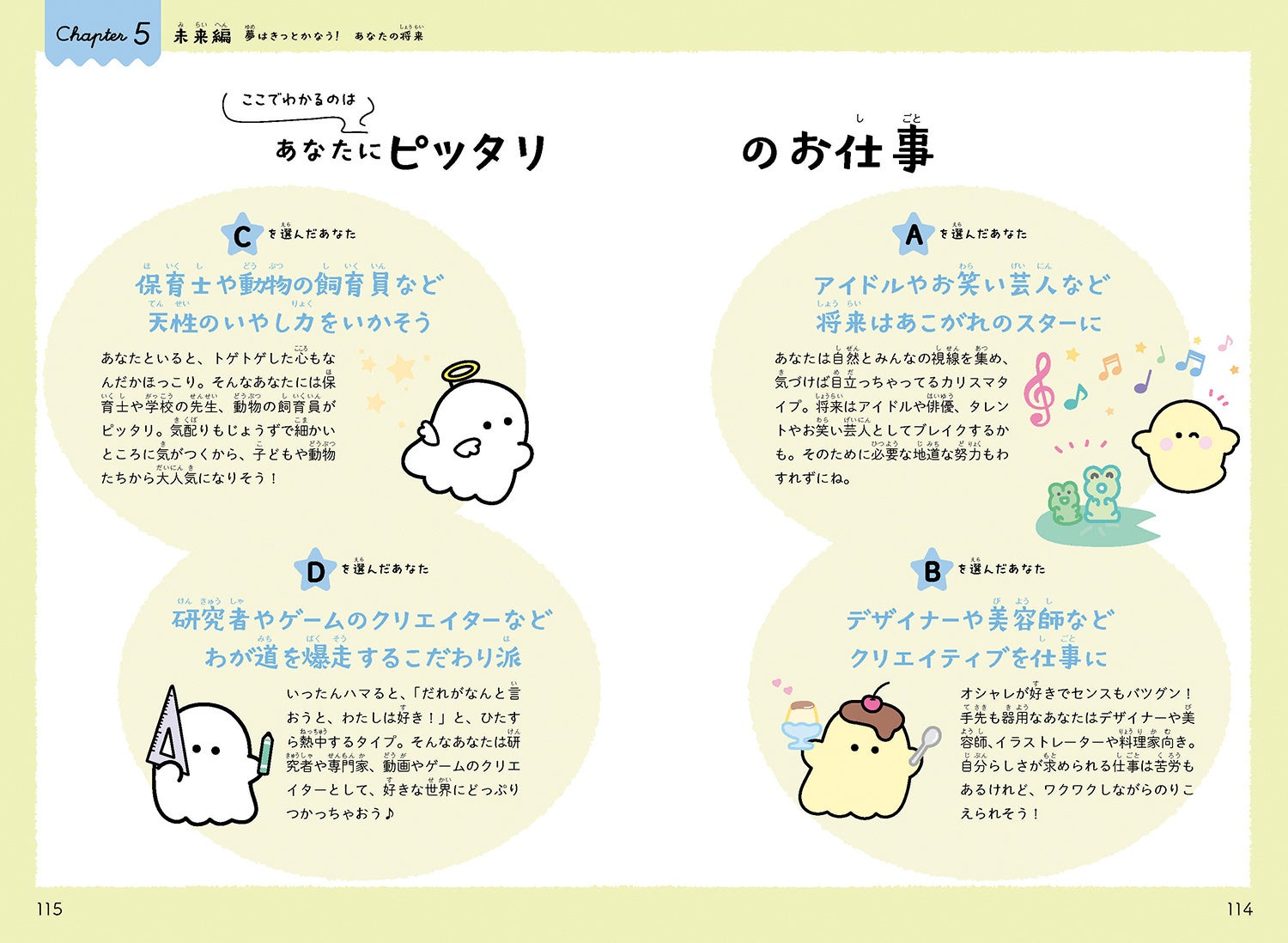 思わず答えたくなる楽しい質問と、ドキッとする深~い診断、キュートなイラストが盛りだくさん。心理テストは「性格」「友情」「恋愛」「未来」の4テーマで、「あなたはどのオバケーヌタイプ?」がわかるキャラクター診断や、オバケーヌのキャラ図鑑も収録しています。