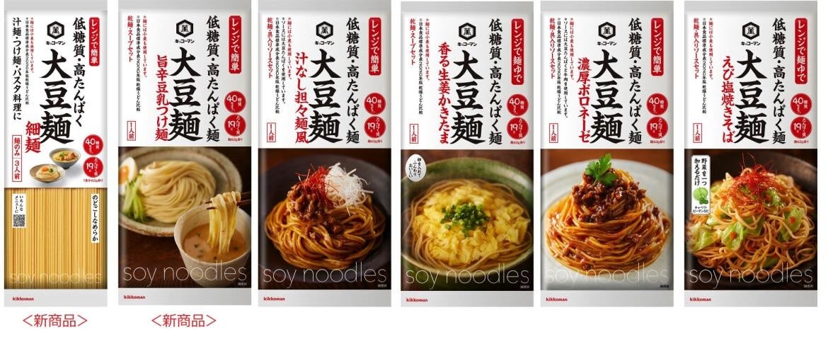 「大豆麺」は、大豆を50%配合した低糖質・高たんぱくで、のどごしなめらかな麺です。2022年8月に、麺とスープやソースをセットにした“新しい主食”として1袋1人前入りで新発売しました。「旨辛豆乳つけ麺」「汁なし担々麺風」「香る生姜かきたま」「濃厚ボロネーゼ」「えび塩焼きそば」の5種類のセット麺タイプと、新商品の麺のみタイプ「大豆麺 細麺 3人前」を合わせ、6種類のラインアップです