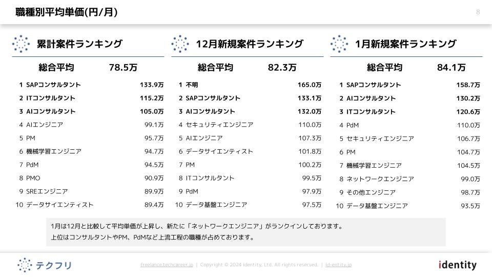 1月は12月と比較して平均単価が上昇し、新たに「ネットワークエンジニア」がランクインしております。