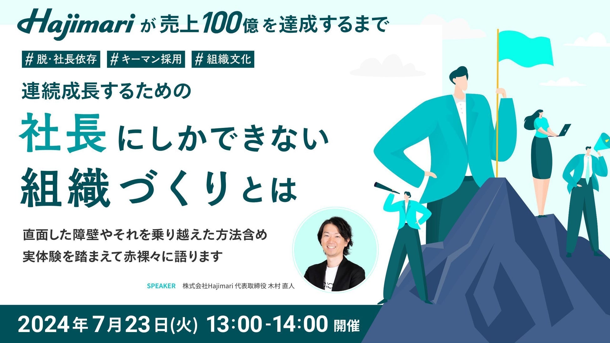 株式会社Hajimari(本社:東京都渋谷区、代表取締役:木村直人)は、7月23日(火)に、経営者や役員の方々に向けて「連続成長するための社長にしかできない組織づくり」を学ぶオンラインセミナーを開催することをお知らせいたします。
