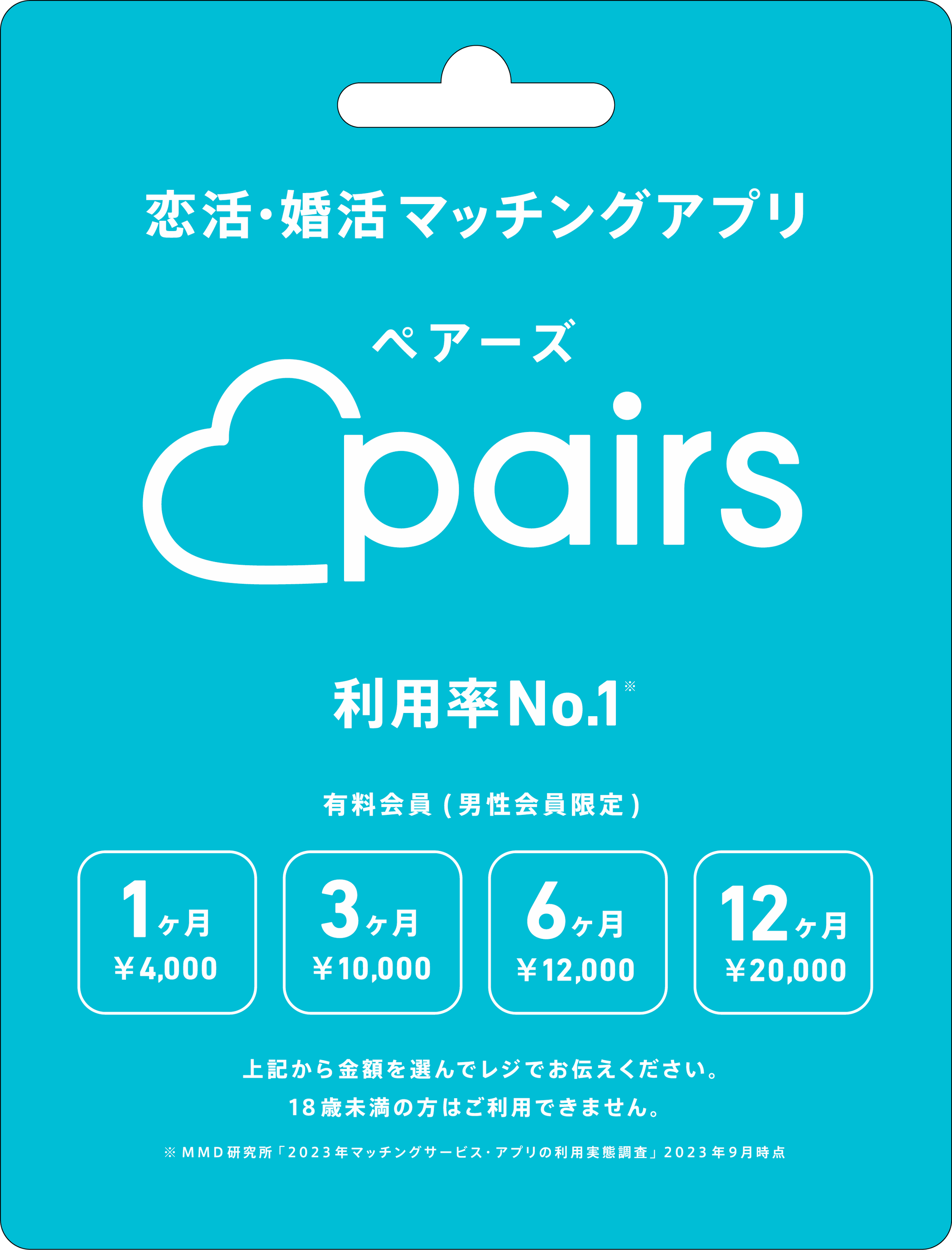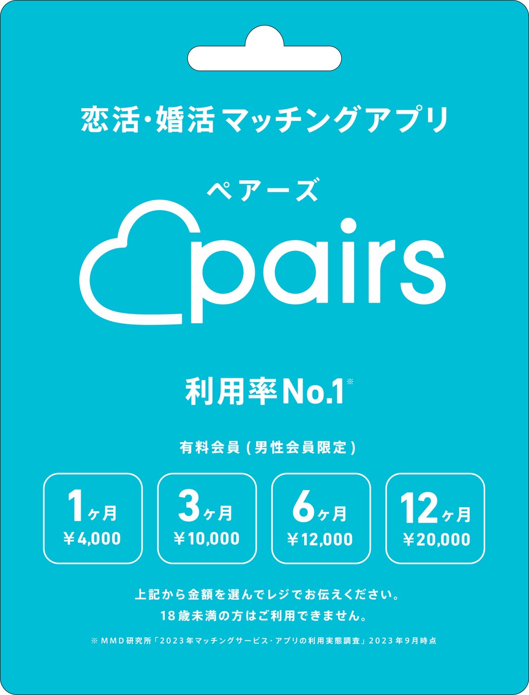 「Pairsプリペイドカード・Pairsデジタルコード」とは、あらかじめ指定して購入したプランでペアーズを利用することのできるカード・デジタルコードです。ペアーズアプリ内決済に必要なクレジットカードが不要で、店舗で購入することができます。ご自分の利用だけでなく、男性のご友人へのギフト用にもおすすめです。