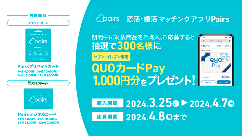 【セブン‐イレブン限定】3月25日(月)よりPairsプリペイドカード、スマホプリペイド版Pairsデジタルコードを購入&応募すると抽選でQUOカードPayが当たるキャンペーンを開催