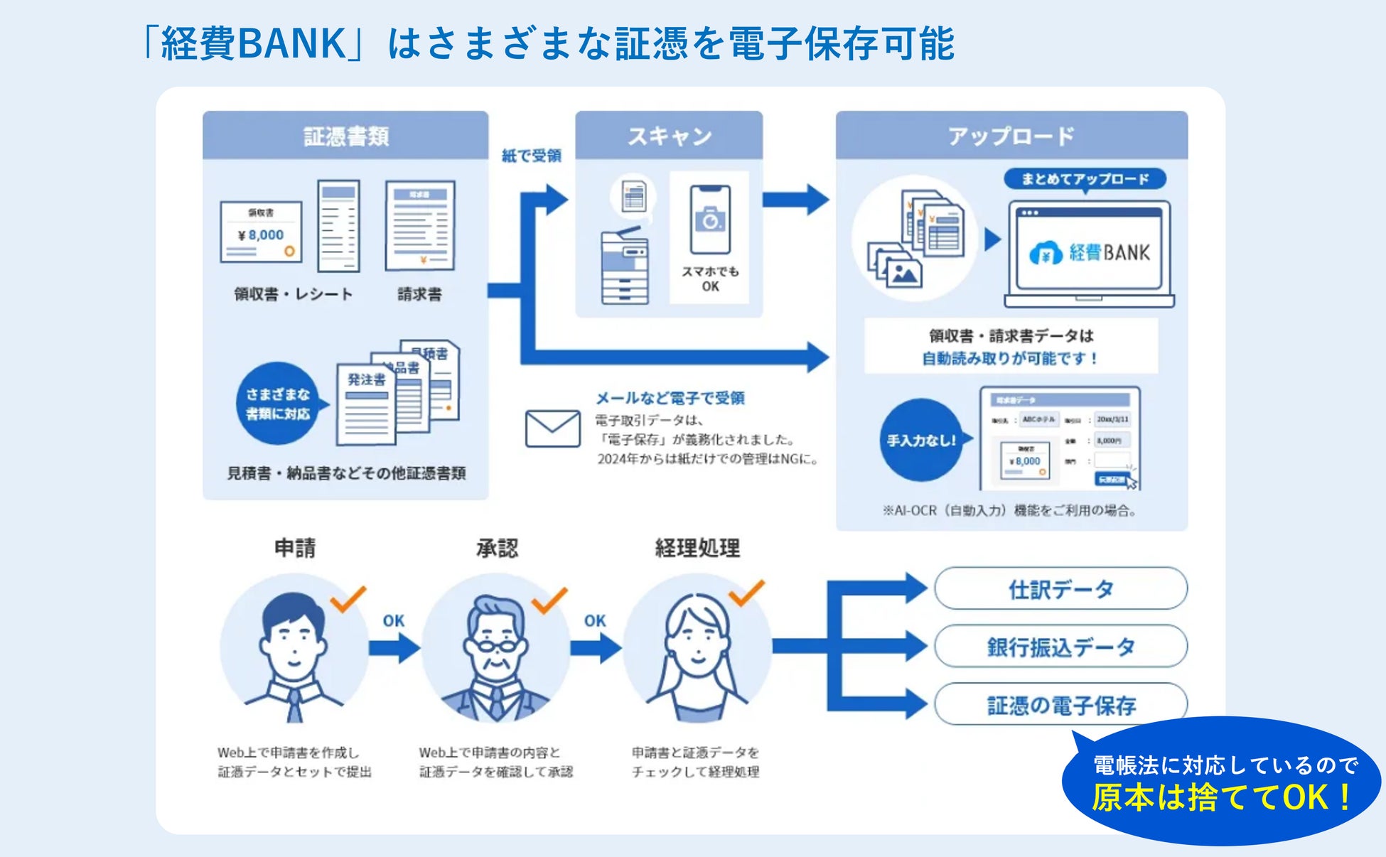 法制度対応と業務効率化の双方を実現するクラウド型経費精算システム「経費BANK」は、高機能でありながら始めやすい低価格と手厚いサポートにより、今後も事業者様に「安心」と「利便性」をお届けいたします。