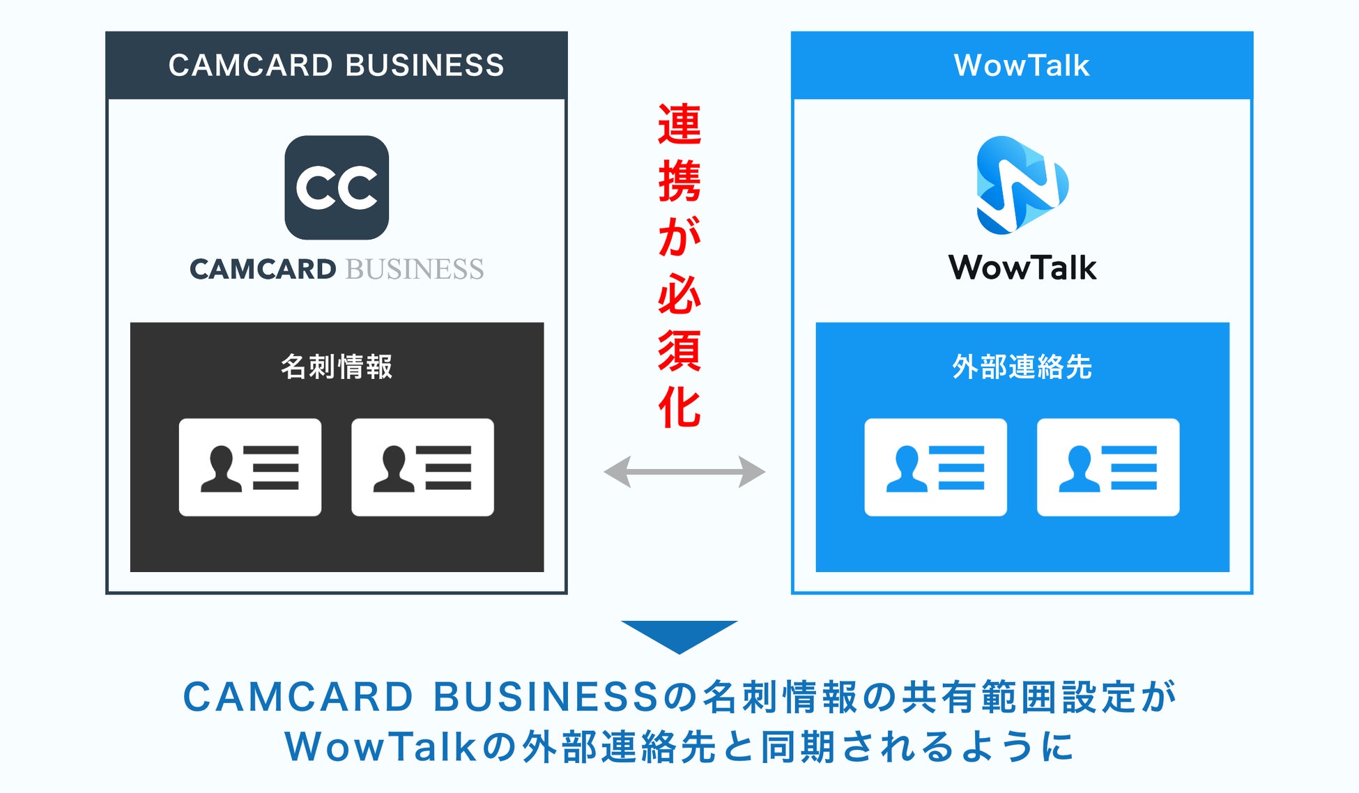 今回のアップデートでは、これまでは任意であったWowTalkとCAMCARD BUSINESSのアカウント連携を必須化し、さらにCAMCARD BUSINESSにおける名刺の共有・閲覧範囲設定をWowTalkの外部連絡先機能に反映させる機能拡張を実施しました。