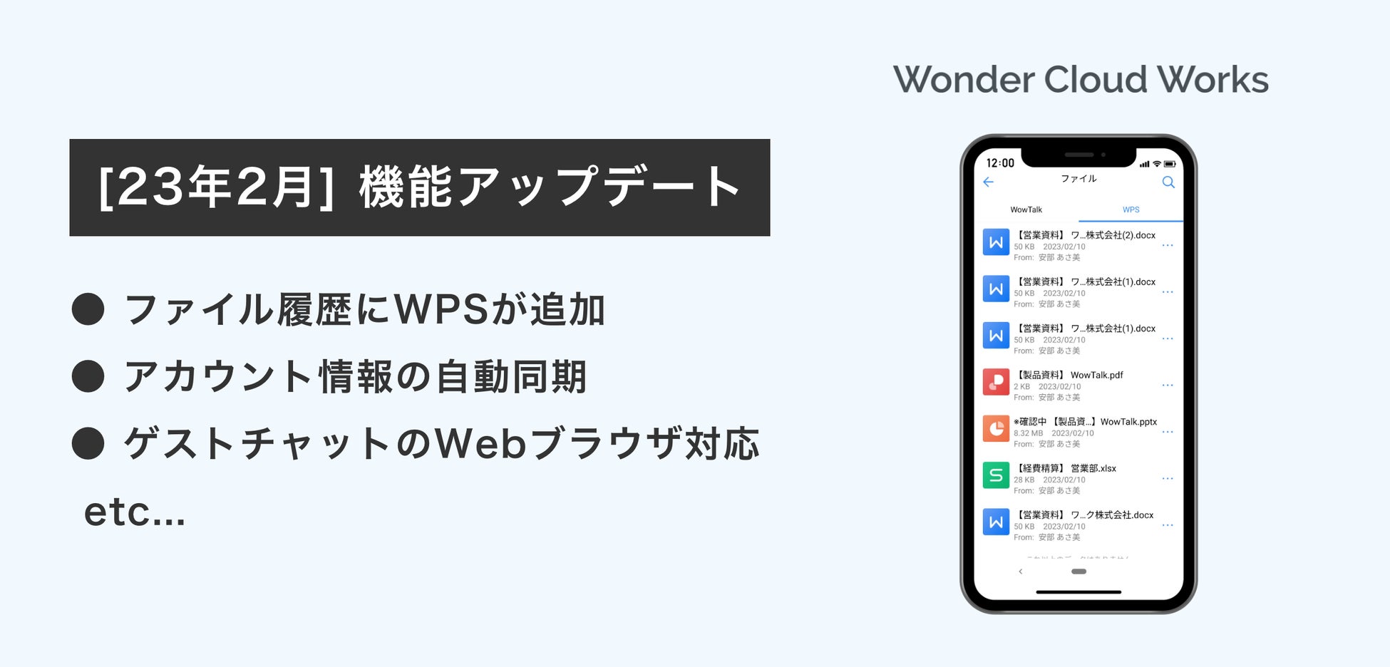 法人向けクラウド型ソリューションサービス「Wonder Cloud Works」を提供するワウテック株式会社(本社:東京都港区、代表取締役社長:瀬沼 悠)は、2023年2月に、Wonder Cloud Worksの各種連携機能に関する機能アップデートを実施しましたことをお知らせいたします。