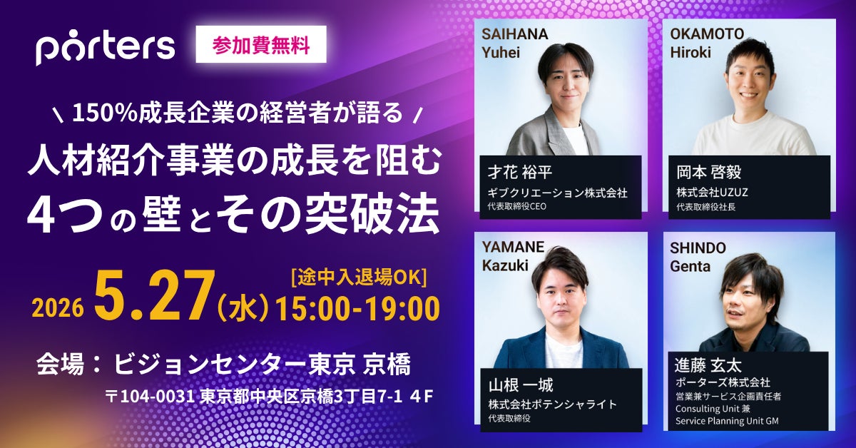 人材ビジネス向けマッチングシステムを提供するポーターズ株式会社(東京都港区、代表 西森 康二)は、2026年5月27日(水)に「150%成長企業の経営者が語る 人材紹介事業の成長を阻む4つの壁とその突破法」を開催いたします。