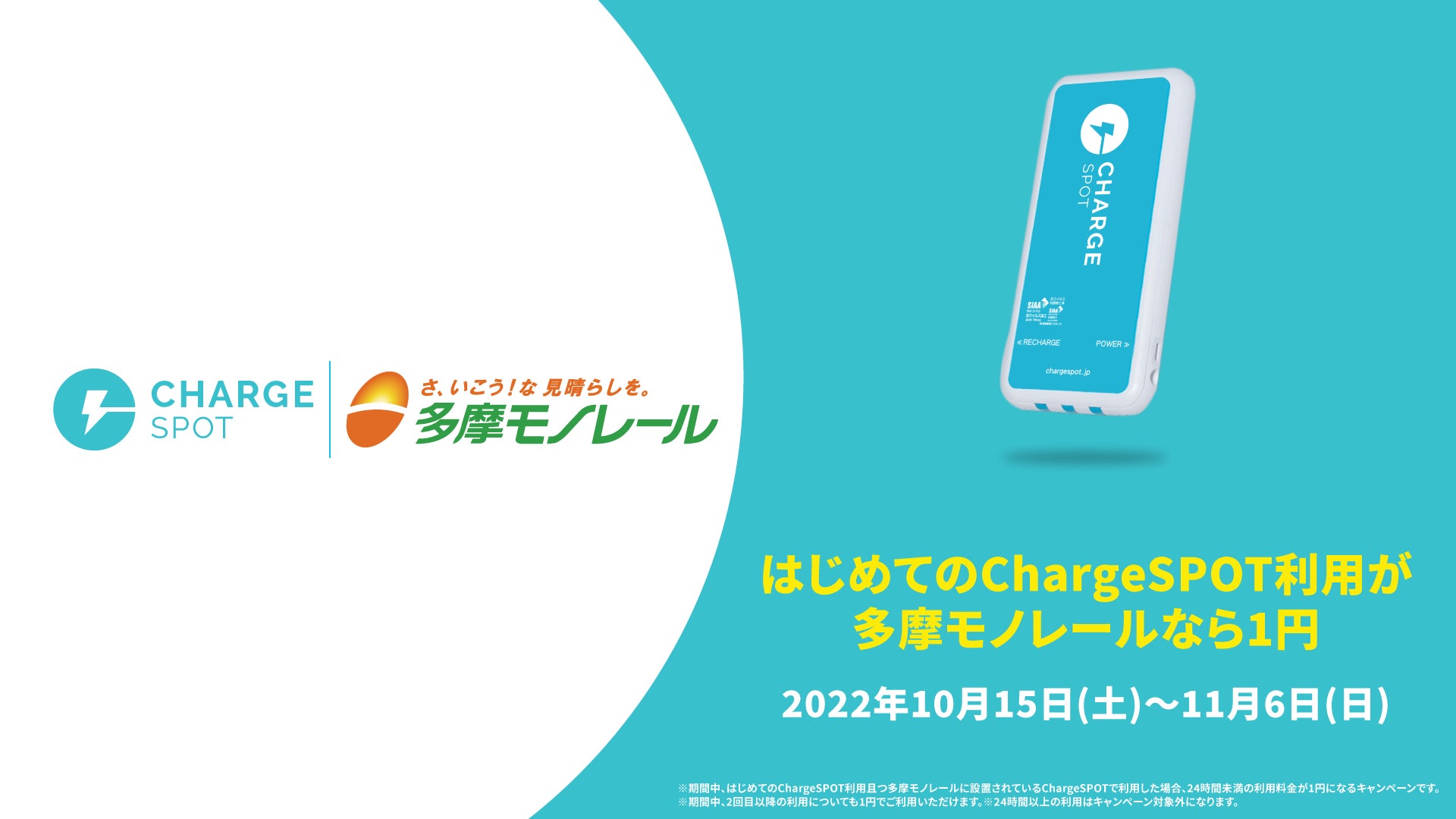 内容:はじめての「ChargeSPOT」利用で多摩モノレールの各駅に設置されたChargeSPOTのバッテリースタンドからバッテリーをレンタルされた場合、24時間未満の利用料金が1円になるキャンペーンです。期間中、キャンペーン対象ユーザーは、2回目以降の利用時にも多摩モノレールに設置されたChargeSPOTのバッテリースタンドからレンタルをする場合には、何度でも1円でご利用いただけます。(24時間未満に返却された場合は、1円でレンタルできます。24時間以上は通常料金が適用されます。)