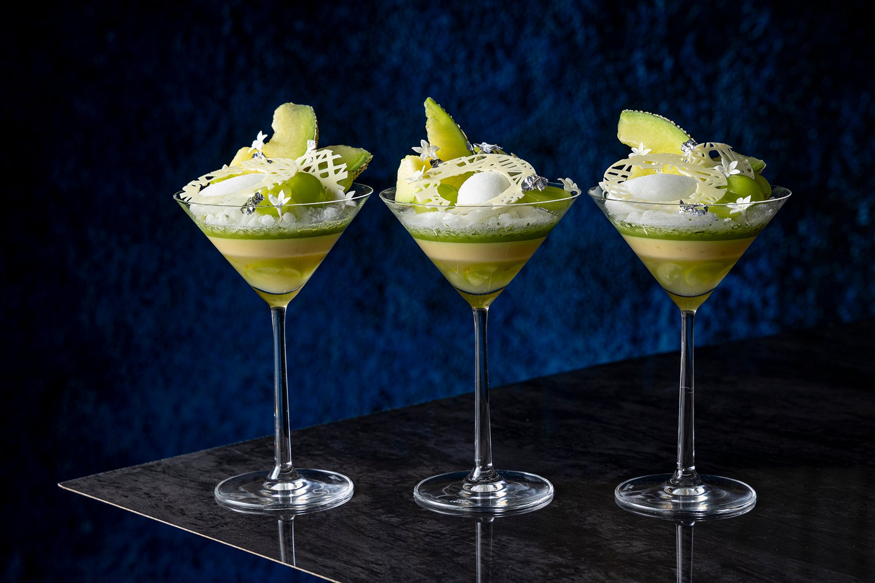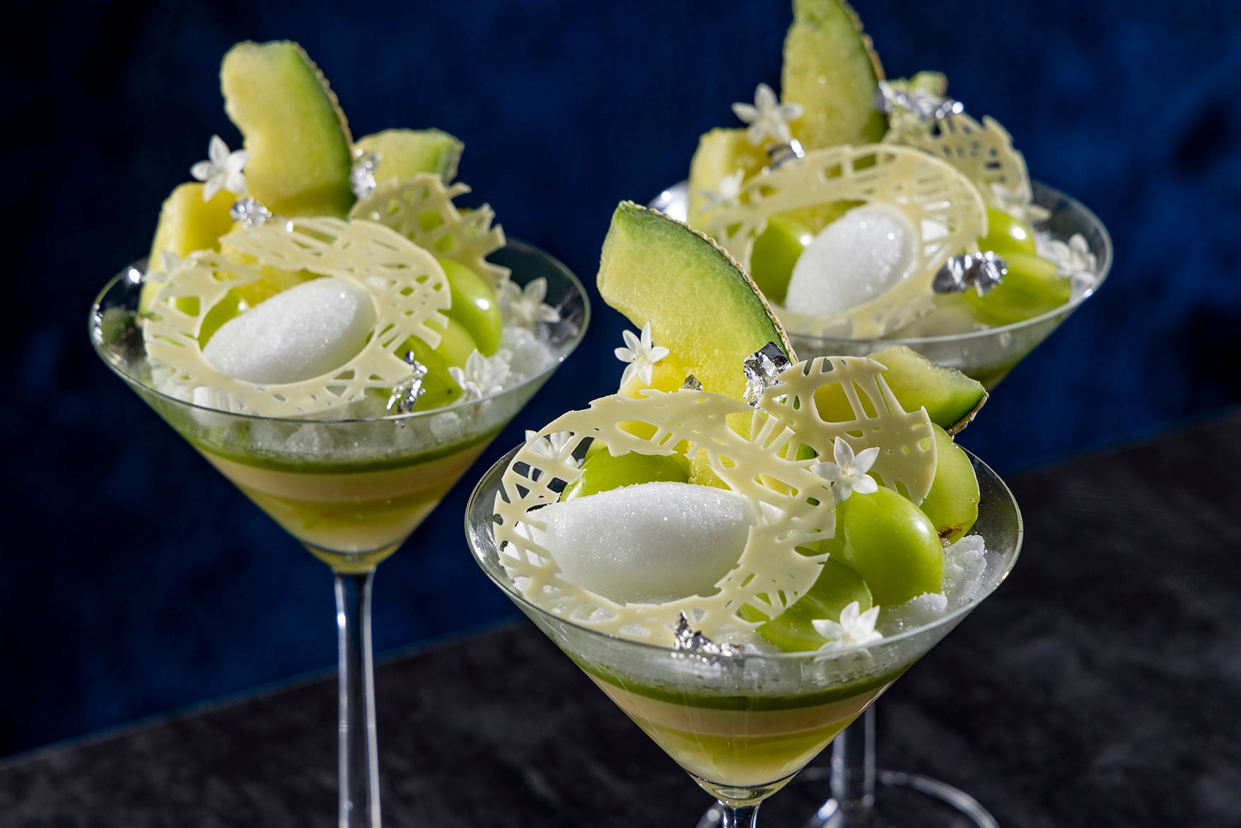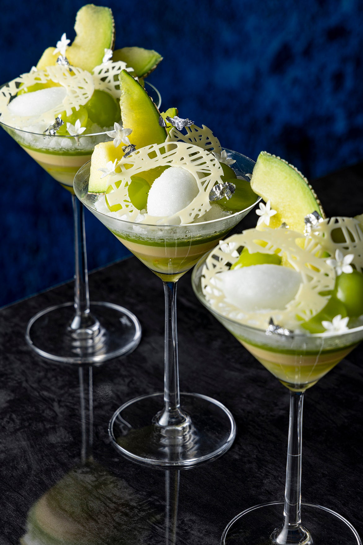 芳醇な果汁をたたえたマスクメロンとエメラルドのような輝きのシャインマスカットを冠した「ヴェール」。白ワインのゼリーと清々しいライムカードクリームが層になり、メロンゼリーやホワイトラム香るモヒートグラニテ、ライムソルベが清涼感を添えます。メロンの網目模様を思わせる繊細なホワイトチョコレートと銀箔をあしらったエレガントなグリーン・カラーパフェ、ヴェールは¥2,900にてお楽しみいただけます。