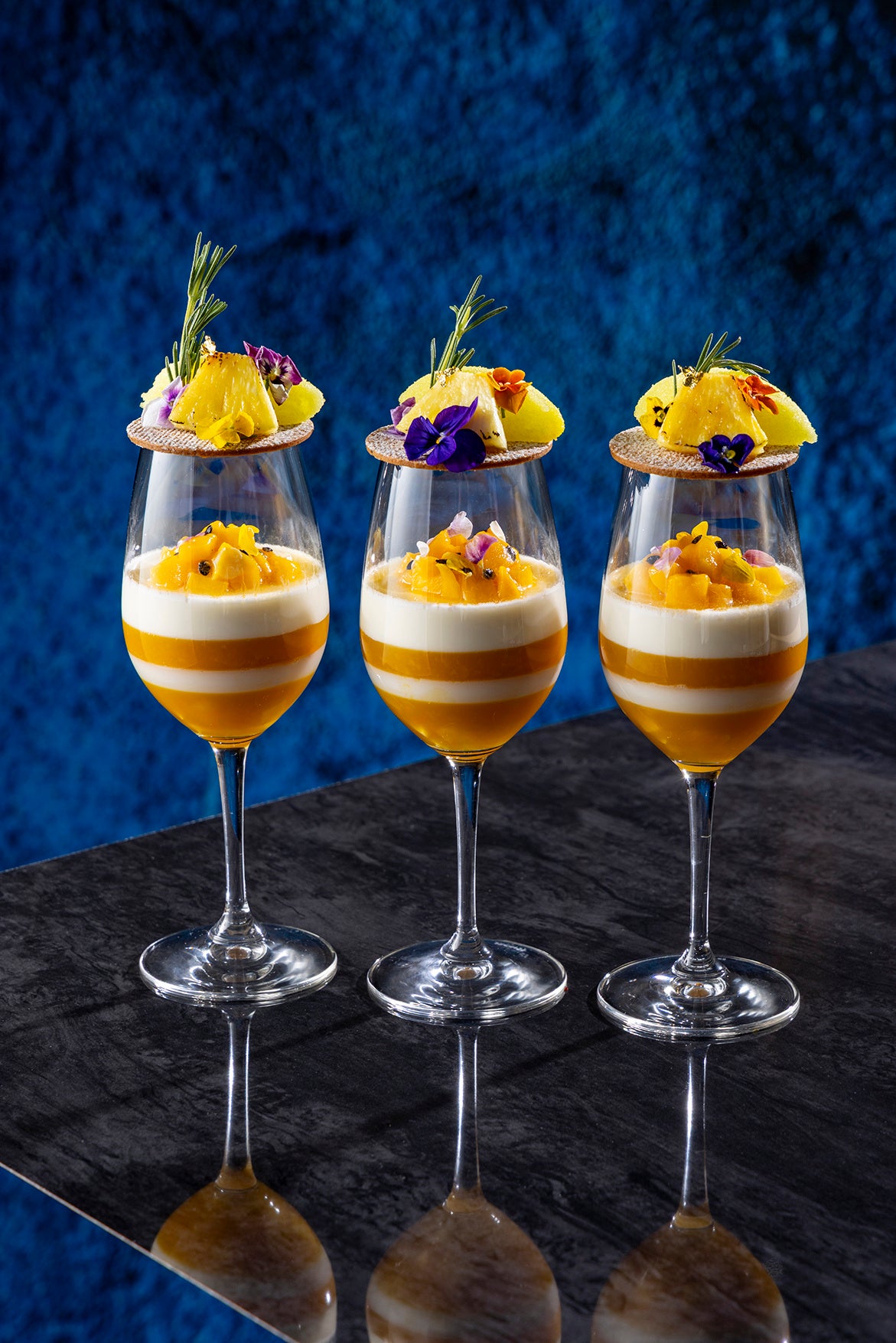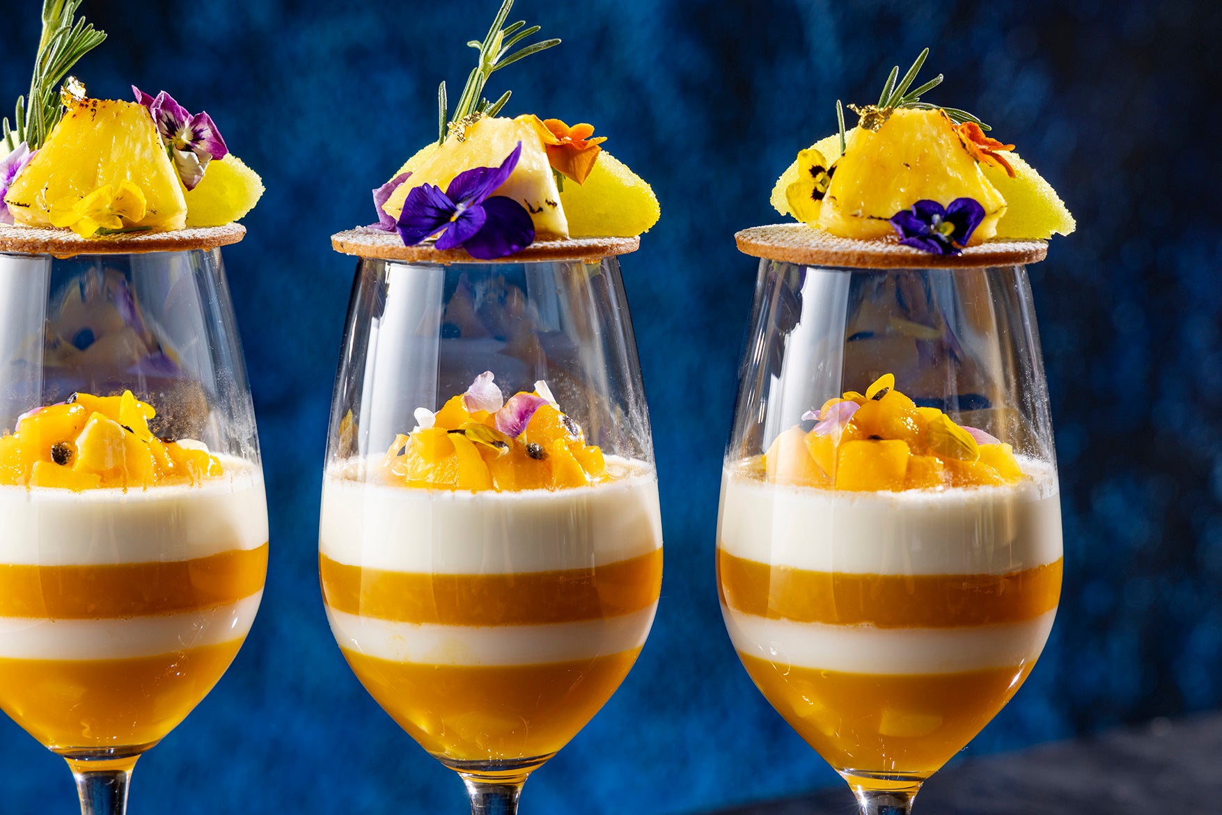 マンゴーやパイナップルにココナッツを重ねた「ピニャコラーダ」/¥2,700は、ひと匙ごとに南国のビーチリゾートの情景がうかぶようなトロピカルな味わいのパフェです。鮮やかなオレンジ色のマンゴーゼリーやパイナップル、パッションフルーツなどを合わせたエキゾチックゼリーにココナッツパンナコッタとマスカルポーネココナッツムースがなめらかに調和し、まるで上質なカクテルを味わっているよう。リモンチェッロとパッションシードでマリネしたフレッシュマンゴーや甘さが凝縮されたグリルパイナップルを合わせ、ひと時のリゾート気分を味わってみてはいかがでしょうか。