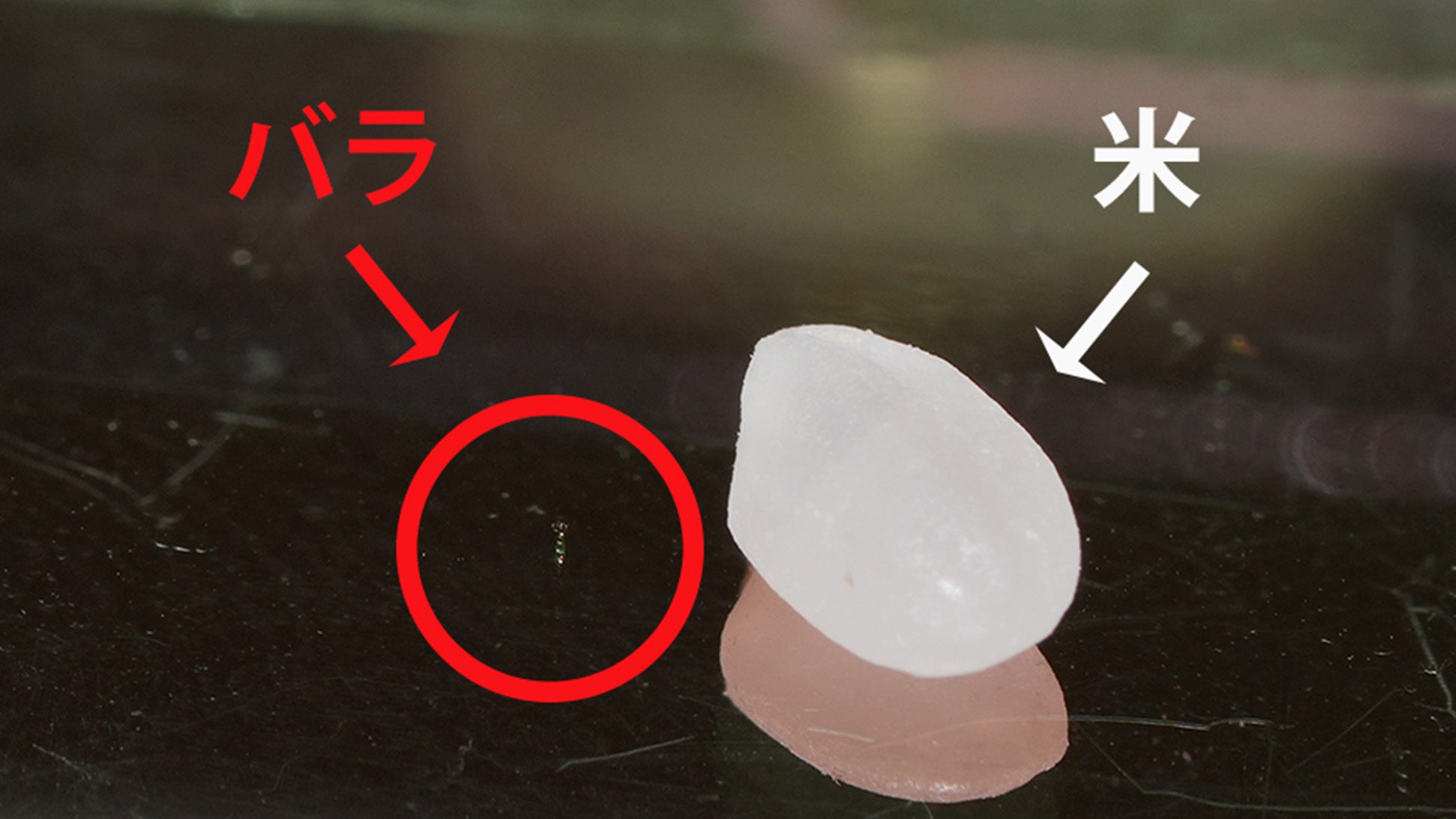 ちなみに、米粒(約5㎜)の10分の1のサイズ。パソコンのキーボードの上に置くと、なんとなく目視はできるものの、埃と見間違うような大きさです。