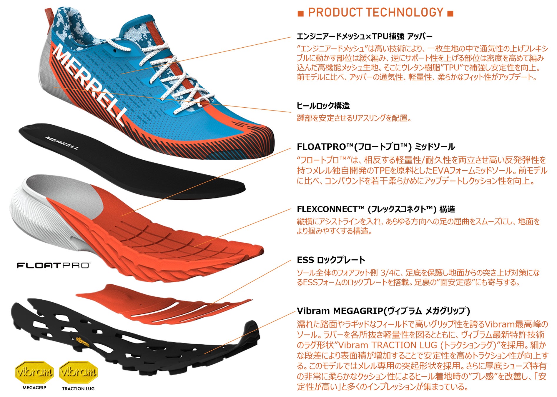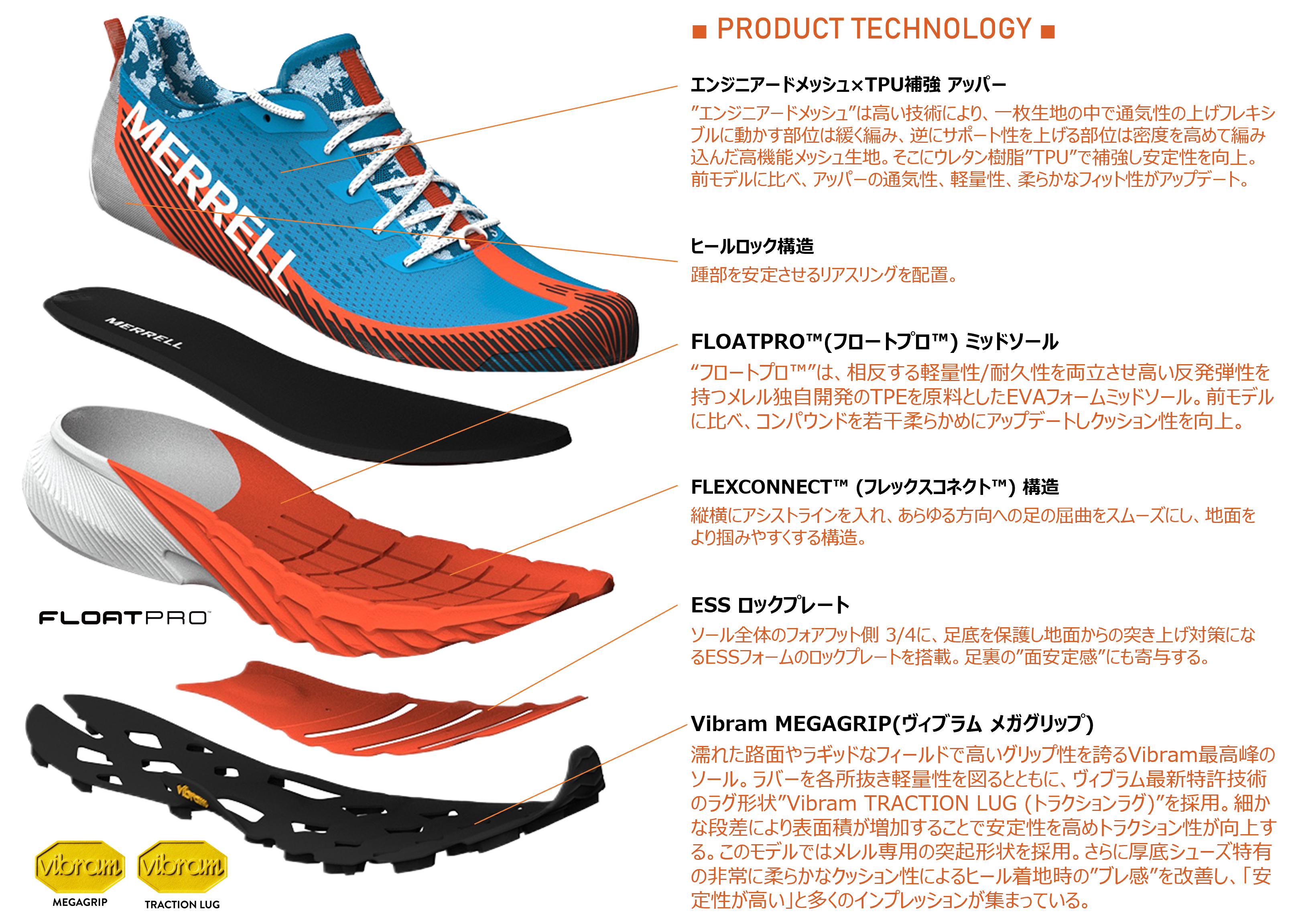 本モデルは、アッパーに通気性と安定性を両立させた高機能”エンジニアードメッシュ”を採用しTPUで補強。ミッドソールには、相反する軽量性と耐久性を合わせ持ち、反発弾性が長時間持続する”FLOATPRO™(フロートプロ™)”フォームを搭載。ヒール高31mmと”厚さ”がある故に、ミッドソールのフォアフット側に縦横のアシストラインを入れ、あらゆる方向への足の屈曲をスムーズにする”FLEXCONNECT™(フレックスコネクト™)”構造を採用。併せてフォアフット側3/4の足底部に、地面からの突き上げ対策になるESSフォームのロックプレートを搭載し足裏の”面安定感”に寄与。アウトソールには、濡れた路面やラギッドなトレイルで圧倒的なグリップ力を誇るイタリアの世界的ソールメーカーVibram社の”Vibram MEGAGRIP (ヴィブラム メガグリップ)”を搭載。さらにVibram最新特許技術のラグ形状”Vibram TRACTION LUG (トラクションラグ)”を採用。特殊な突起形状をラグ側面に配置し、表面積を増加させることでトラクション性向上に期待ができます。またグリップ力が左右されるラグパターンやラグの深さ(5mm)にもこだわっており、長距離・長時間でも、あらゆるフィールドコンディションでパフォーマンスを発揮します。またMERRELLのサステナブルアクションの1つとして、シューレース・ウェビング・ライニング・フットベッドには100%リサイクル素材を使用。本モデルは、厚底シューズ特有の非常に柔らかなクッション性によるヒール着地時の”ブレ感”というリスクを解消する設計となっており、”安定性が高い”と多くのユーザーから高評価のインプレッションが集まっています。