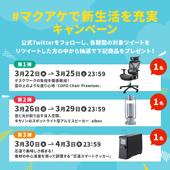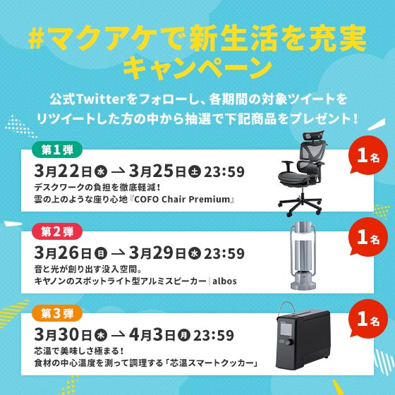 また同期間に、Twitterのハッシュタグ投稿を活用して、新生活を充実させる家具・家電などの商品が当たる「#マクアケで新生活を充実キャンペーン」を同時開催します。