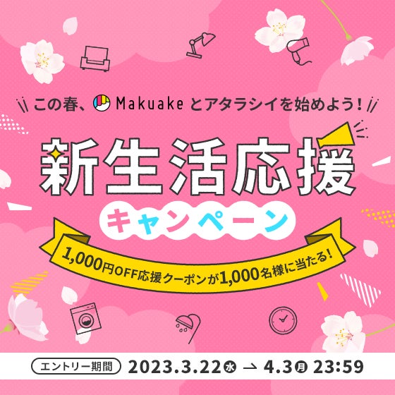 アタラシイものや体験の応援購入サービス「Makuake(マクアケ)」を運営する株式会社マクアケ(以下、当社)は、2023年3月22日(水)から、期間中にキャンペーンページにてエントリーし、「Makuake」で3件以上のプロジェクトに「気になる」登録をしたサポーターの中から、抽選で1,000名に1,000円分の応援クーポン(※1)が当たる「新生活応援キャンペーン」を開始します。