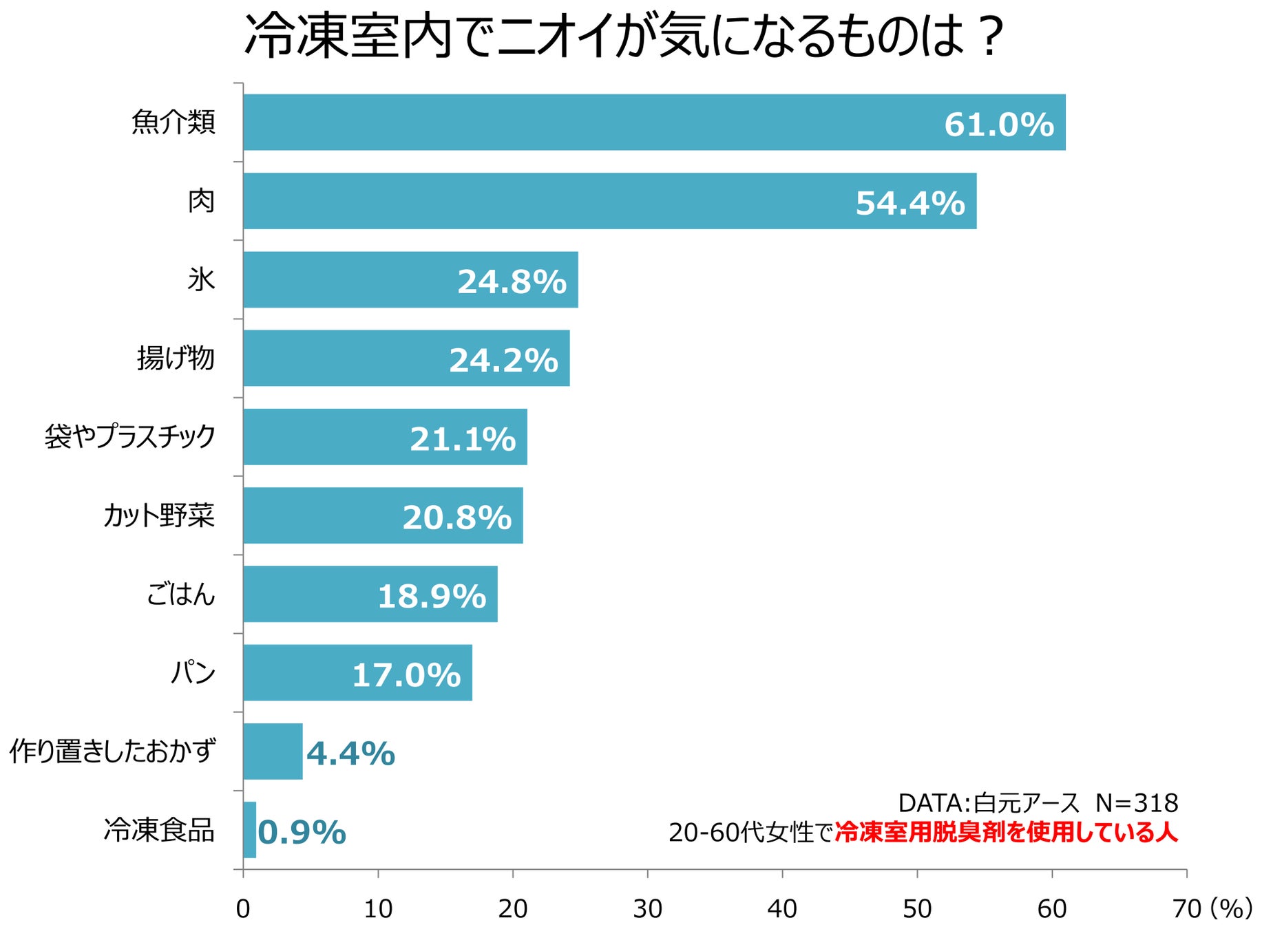 今回当社が独自に調査したところ、冷凍室用脱臭剤ユーザーは、冷凍室内でニオイが気になる対象として様々なものを挙げていることが分かりました(下図参照)。