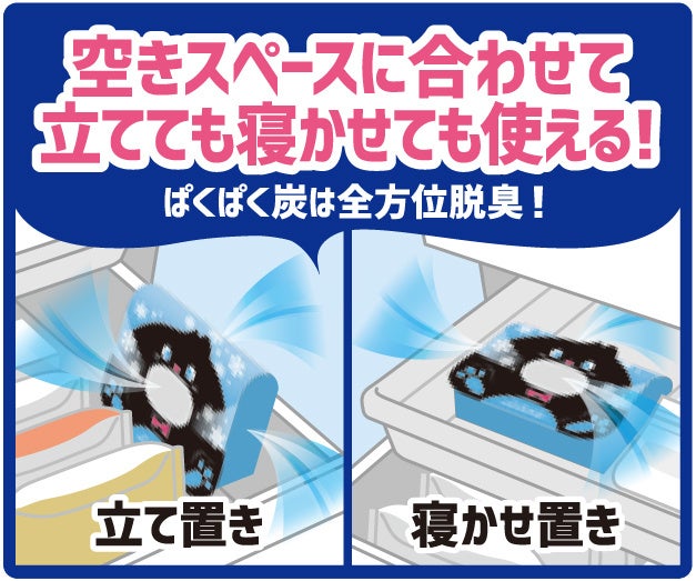 『ノンスメル ぱくぱく炭 冷凍室用』は、主成分としてニオイの吸着性に優れたヤシガラ活性炭を使用した冷凍室用脱臭剤です。活性炭はニオイの吸着面積が備長炭の約5倍あり、脱臭力に優れています。さらに、備長炭、竹炭を加えたトリプル炭処方で、冷凍室内で気になる冷凍臭※に対応しつつ、氷や食品へのニオイうつりも防ぎます。また、脱臭効果は約1年間しっかり持続します。容器はニオイを食べるモンスターをかたどったかわいいデザインで、かつ通気孔を容器全面に配置した全方位脱臭形状となっており、空きスペースに合わせて立てても寝かせても使えます。加えて、素材は紙でできており、使用後は燃えるゴミとして捨てられるECO仕様となっています。