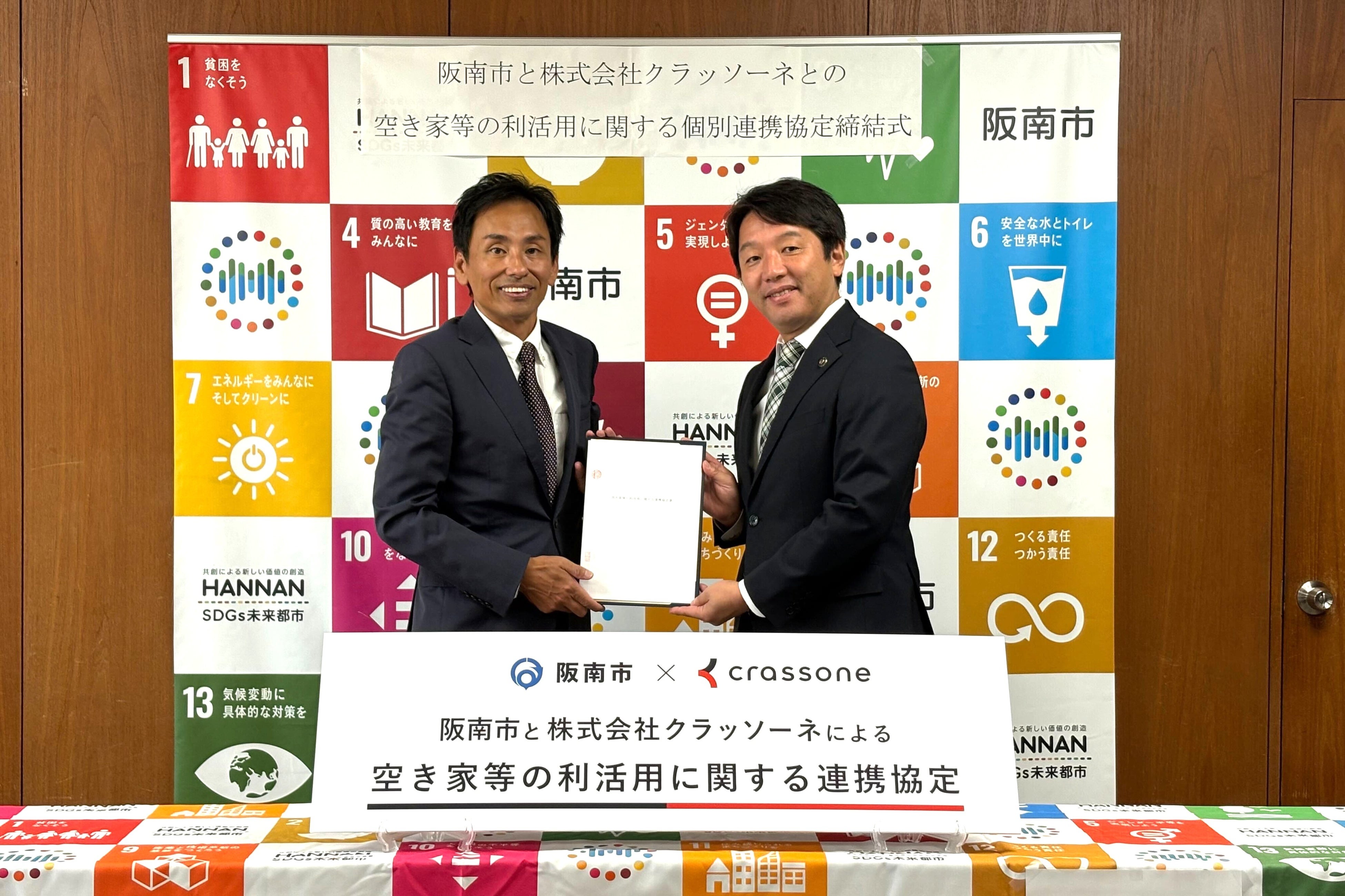 解体工事DXプラットフォーム「クラッソーネ」を運営する株式会社クラッソーネ(愛知県名古屋市、代表取締役CEO:川口 哲平、以下「当社」)は、大阪府阪南市(以下、「阪南市」)と「空き家等の利活用に関する連携協定」を締結いたしました。昨今、全国的にも社会課題となっている空き家問題への対策として、阪南市の空き家除却を推進することで、安全安心なまちづくりを目指します。また本締結で、当社の自治体連携の実績は153自治体(行政運営の団体含む)となり、全国での人口カバー率は約19%、大阪府内では約14.6%となりました(※1)。