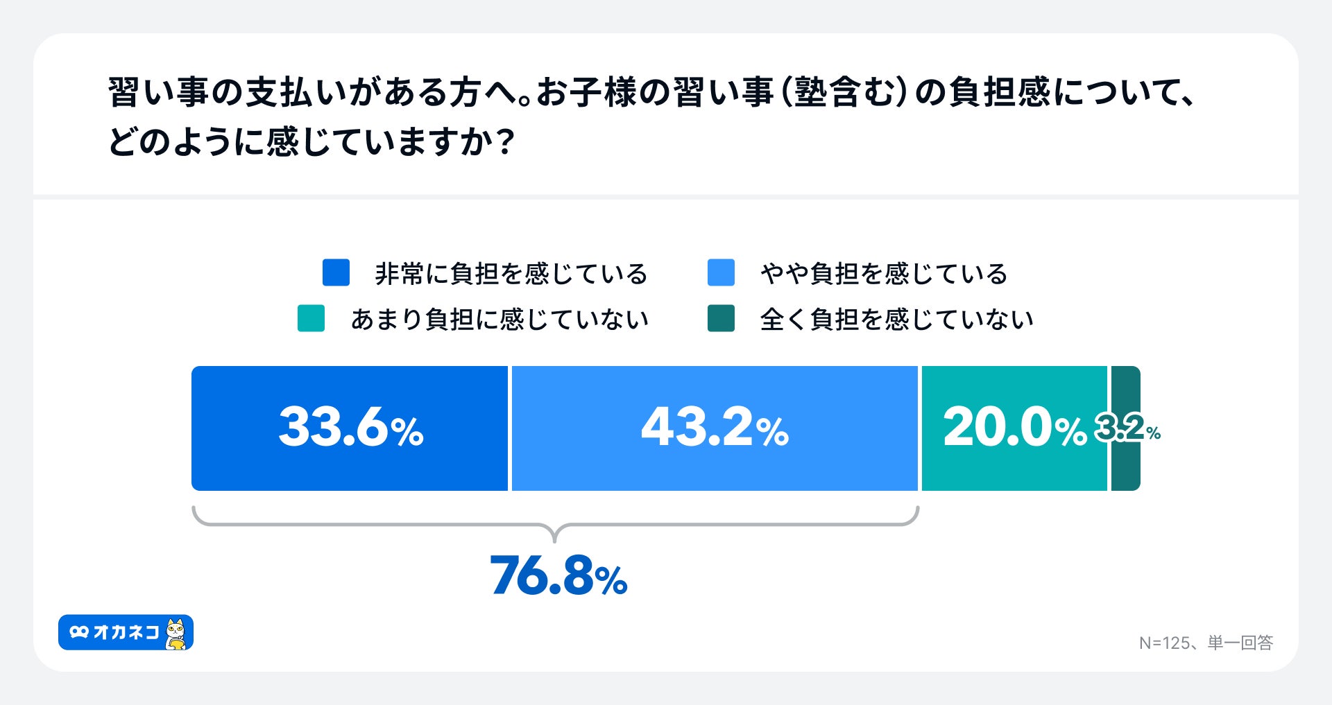 習い事(塾含む)の負担感に関しては、76.8%が負担感を「感じている」と回答しました。特に33.6%が「非常に負担を感じている」と回答しており、学費(学校関連費用)と同様に負担感が高い結果となりました。