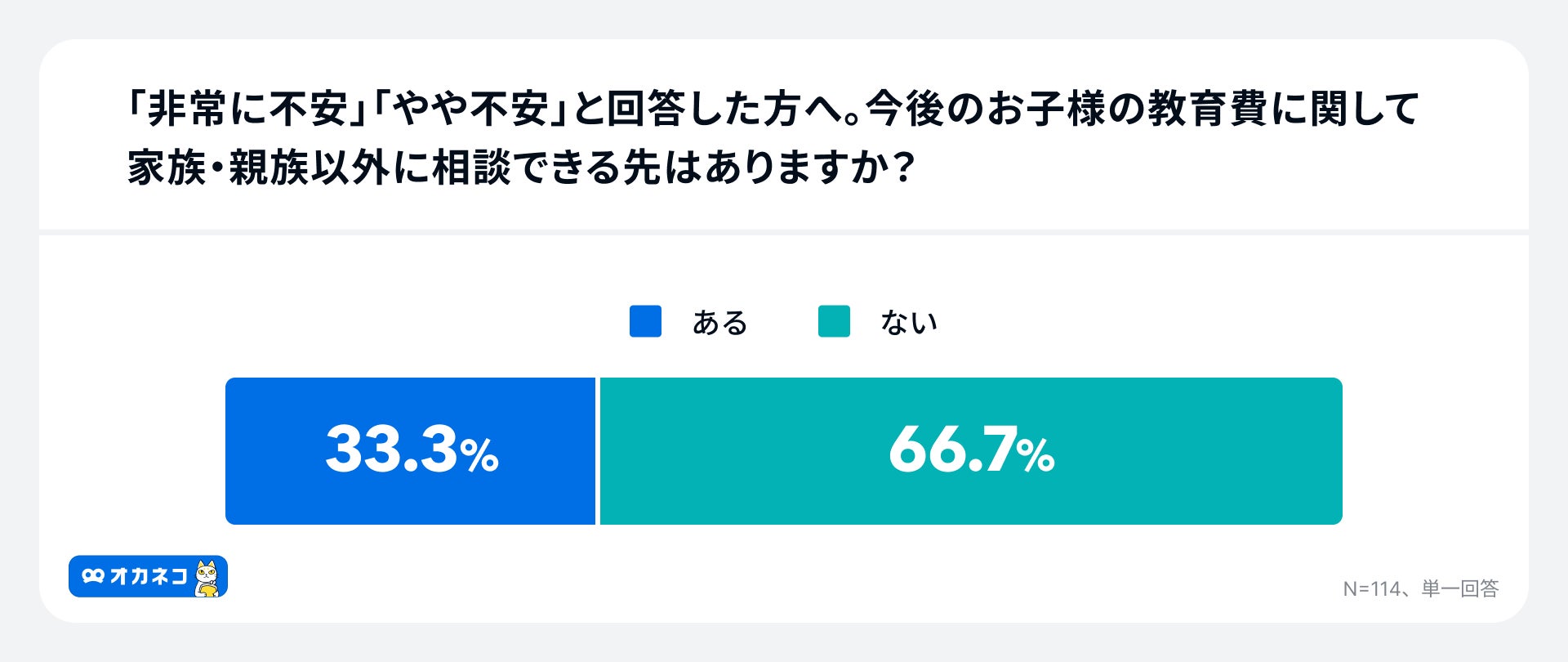 教育費に関して不安を感じている家庭のうち66.7%は「家族・親族以外に相談できる相手がいない」と回答した結果となりました。