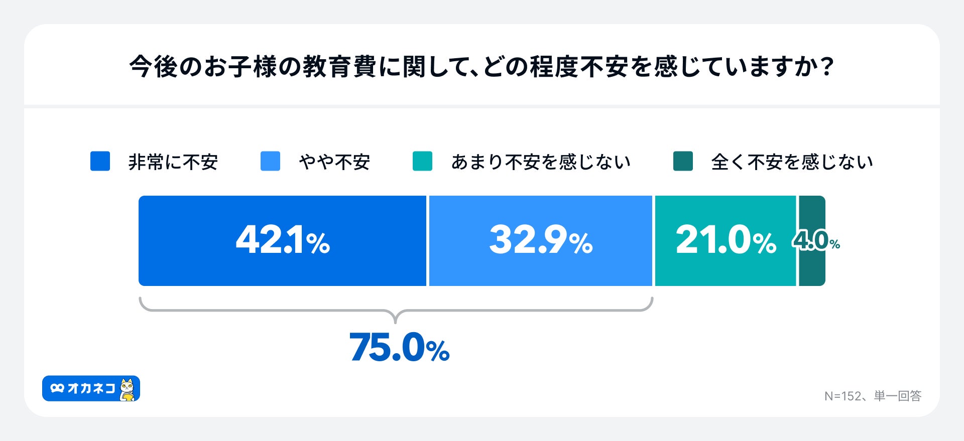 今後の教育費に関して不安を感じている割合は75.0%でした。そのうち42.1%が「非常に不安」と回答しており、物価高や教育費の将来的な高騰に対する懸念が強いことが分かります。