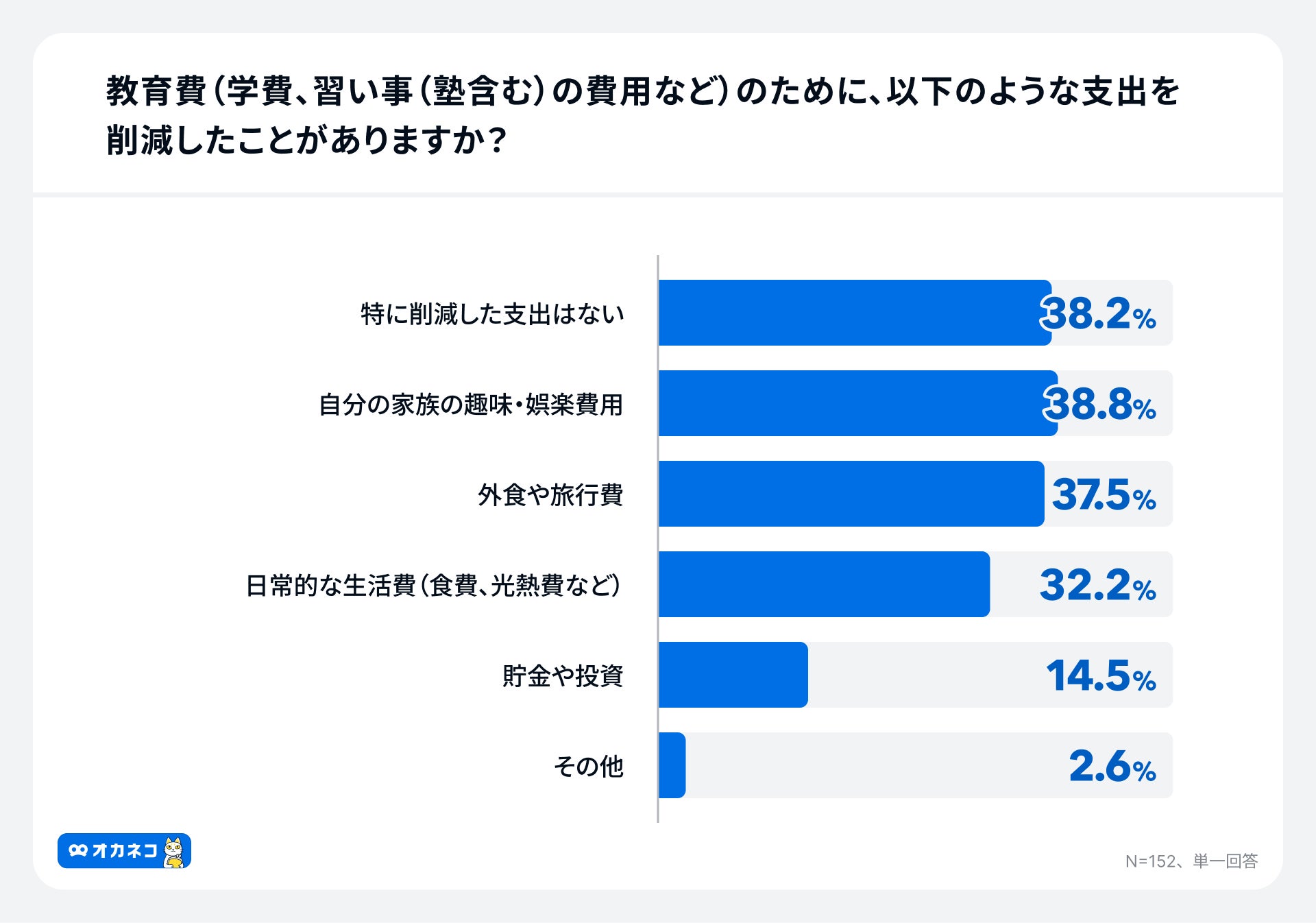 家庭が教育費を捻出するために他の支出を削減している状況は、家計への深刻な圧力を示しており、今後の家計管理においても慎重な対応が求められます。