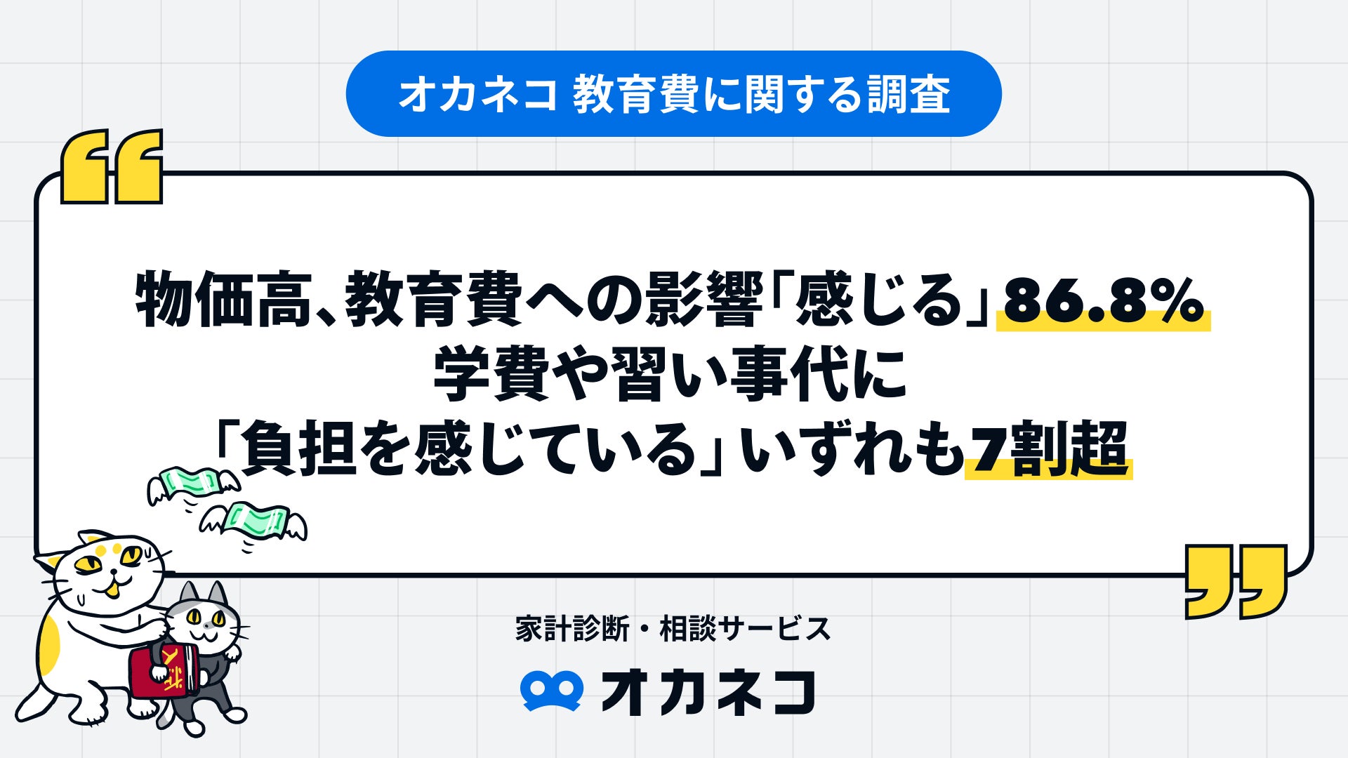 国内最大級(※1)の家計診断・相談サービス『オカネコ』を運営する株式会社400F(フォーハンドレッド・エフ、本社:東京都中央区、代表取締役社長:中村 仁、以下「当社」)は、物価高が家計に与える影響のうち、特に教育費への影響に関する調査をするべく、全国の『オカネコ』ユーザーのうち教育費(学費、習い事、塾の費用など)の支払いがある子どもがいる男女152人を対象に『オカネコ 教育費に関する調査』を実施しました。