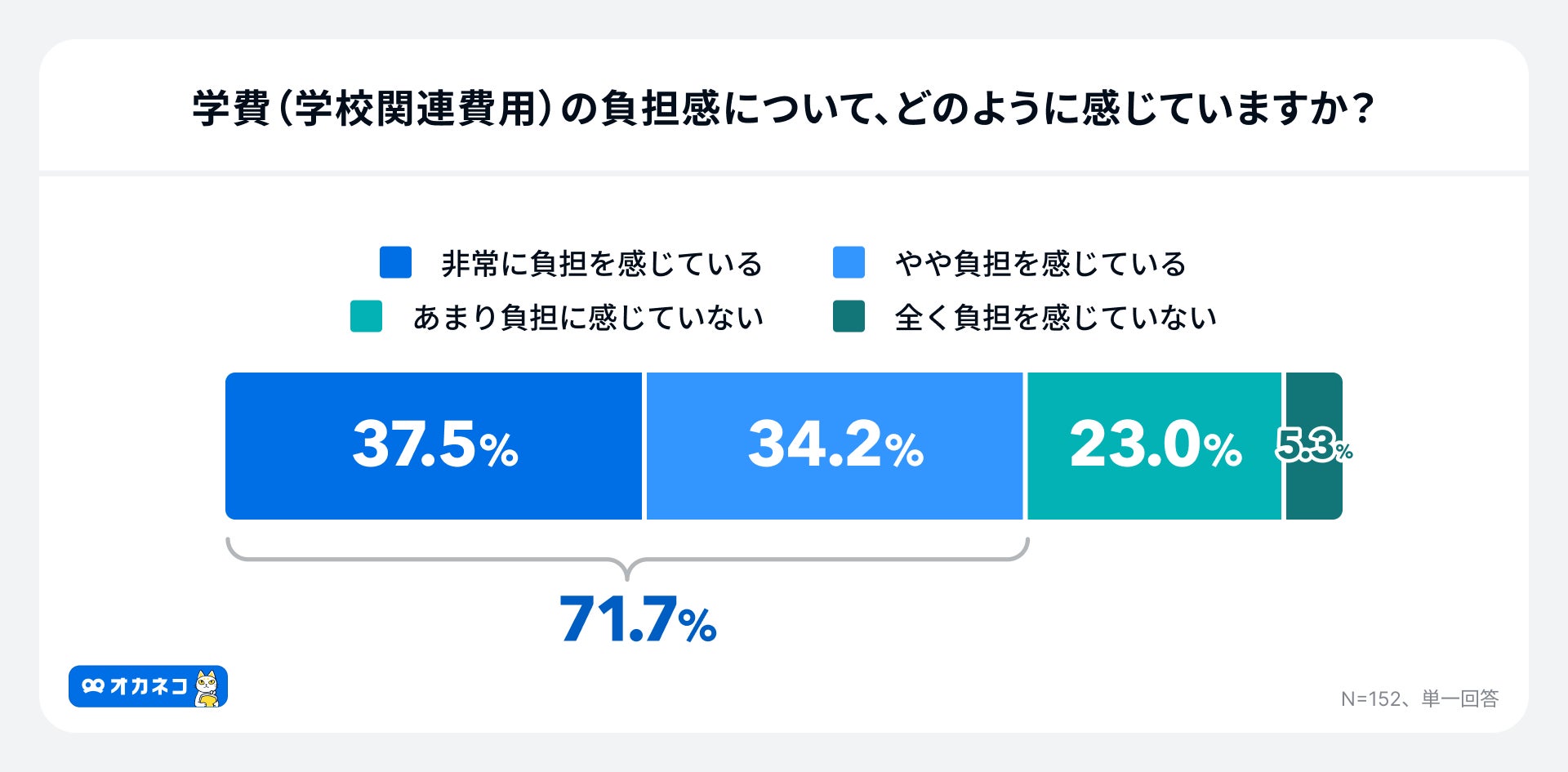 学費(学校関連費用)の負担感を「感じている」と回答した人は71.7%でした。特に37.5%が「非常に負担を感じている」と回答しており学費の負担が大きな問題となっていることが浮き彫りになりました。