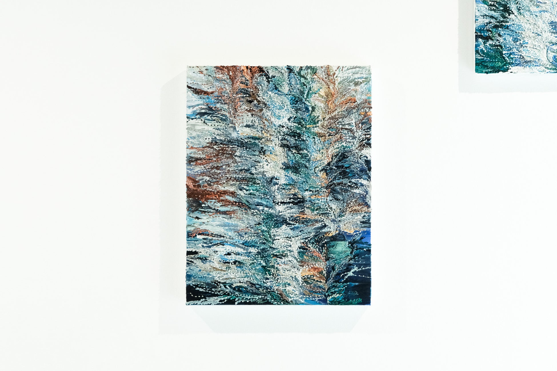 1990 年東京生まれ。平面作品を中心に、粒子の感触を確かめるように人間と物質の関係の再考を試み、人・動物・モノ・環境などが一体性をもった自然観を表現している。情報技術の発達によって記号化されたものの結びつきは強まったが、 他方で記号化未満の事物への感性は弱まってしまうのではないだろうか。それによって周囲を取り巻くものに対しての実感が薄れてしまっているように感じている。こうした時代の中で失われてしまった様々な物体と人間の関係の回復を試みるように、近代的な世界観とは異なる、人間を含めた生物と自然が一体化した世界観を提示している。私たち自身が、絡まり合った世界の一部として生きる事を再認識する事によって、現代の人間の生を再考できるのではないだろうかと考えている。アクリル絵の具を流れる 粒子のように物質的な状態として扱い、積層して彫刻刀やカッターの刃などを用いて削り出すなど、平面を主な媒体としながら、触覚的あるいは彫刻的ともいえる手法を用いて制作をしている。
