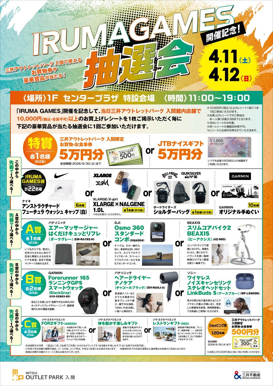 さらに、イベント期間中の2日間、三井アウトレットパーク 入間で使えるお買物券や豪華賞品が当たる「IRUMA GAMES 開催記念!抽選会」 をセンタープラザ特設会場にて実施します。