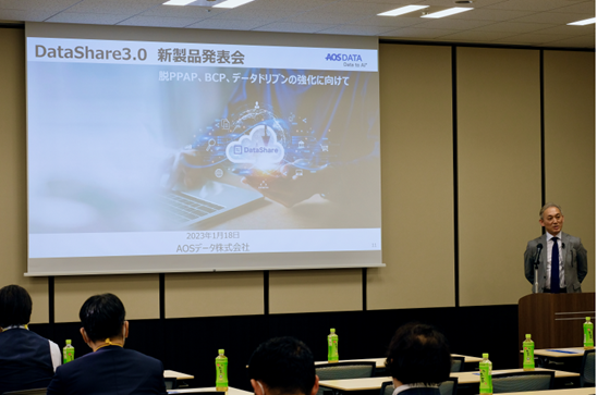 クラウドデータ、システムデータ、リーガルデータ、AIデータなどのデータアセットマネジメント事業を展開するAOSデータ株式会社(本社:東京都港区、代表取締役社長 春山 洋 以下AOSデータ社)は、セキュリティを確保しながらデータを共有する技術の発展がもたらすデータシェアリング時代の到来に向け、「安心」「安全」「使いやすさ」をコアコンセプトに開発し、誰もが使える機能とセキュアな環境をワンストップで提供する「BCP・脱PPAP対策・データドリブン」を強化する次世代データプラットフォーム「DataShare3.0新製品発表会」を2023年1月18日(水)に開催しました。本レポートでは、各セッションの要約を紹介します。また、「DataShare3.0」の3か月間無料トライアルは、こちらよりご登録ください:https://lp01.aosdata.co.jp/datashare/trial_001/