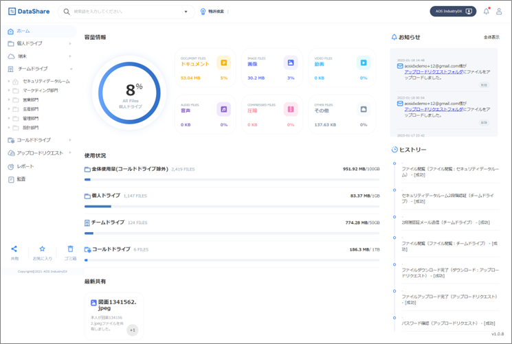 「DataShare3.0」は、個人ドライブ、チームドライブ、そしてコールドドライブ(長期保管用)の3つのドライブでデータ保管を行ない、コストを含めた最適化を図ります。また、自動フルバックアップを行ない、BCPなどにも有効です。