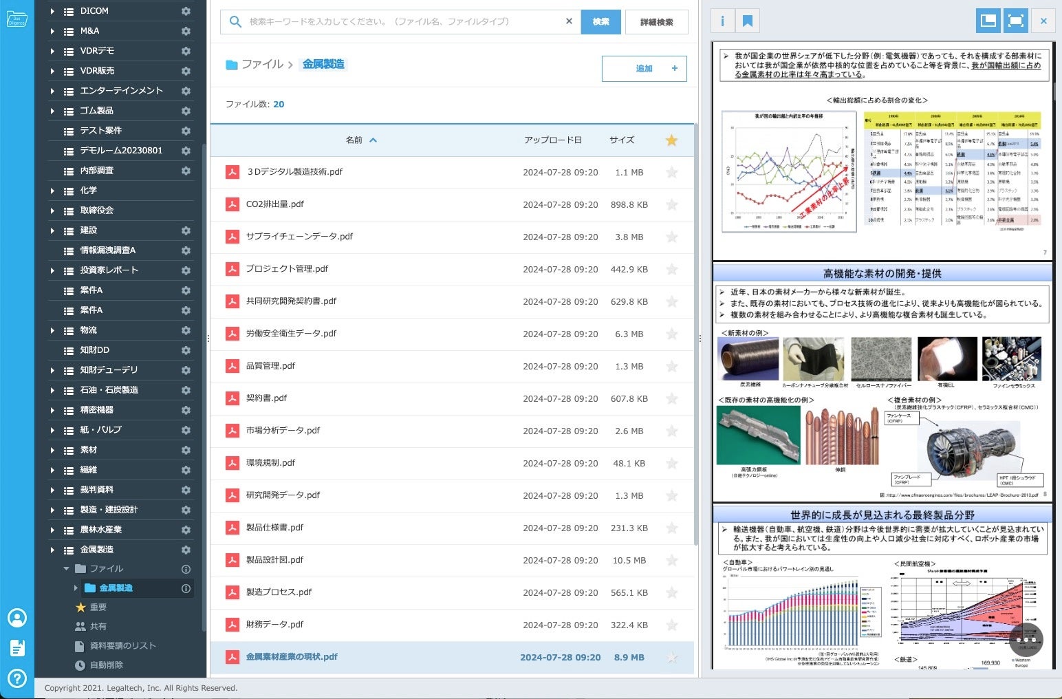 リーガルテックVDR (Virtual Data Room) は、金属製造業において以下のような機能を提供し、さまざまな業務プロセスを支援することができます。