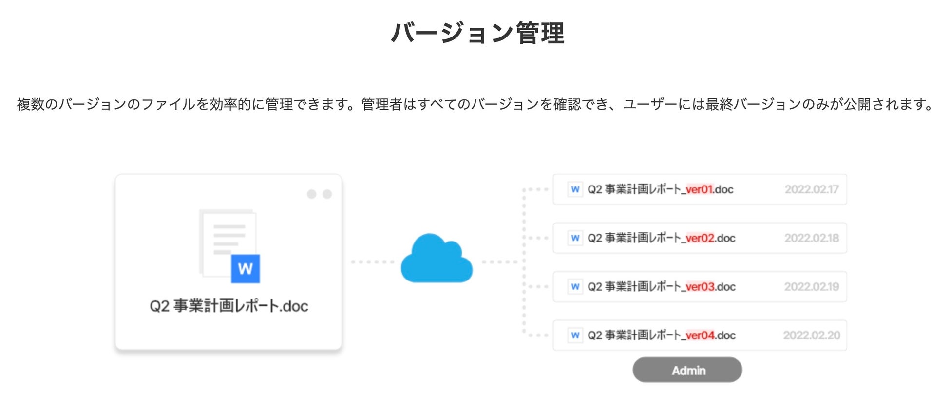 •バージョン管理:ドキュメントのバージョンを管理し、最新の情報を常に保持します。