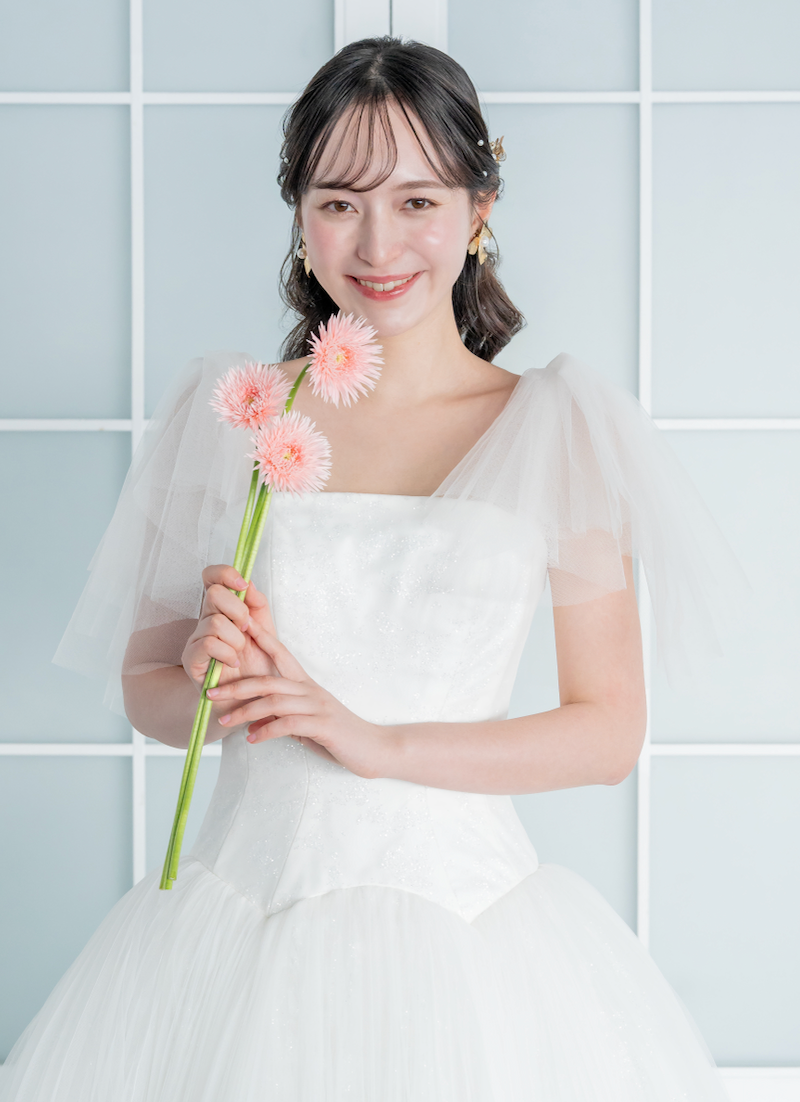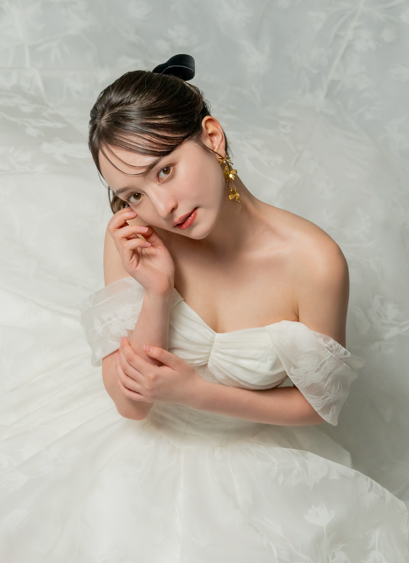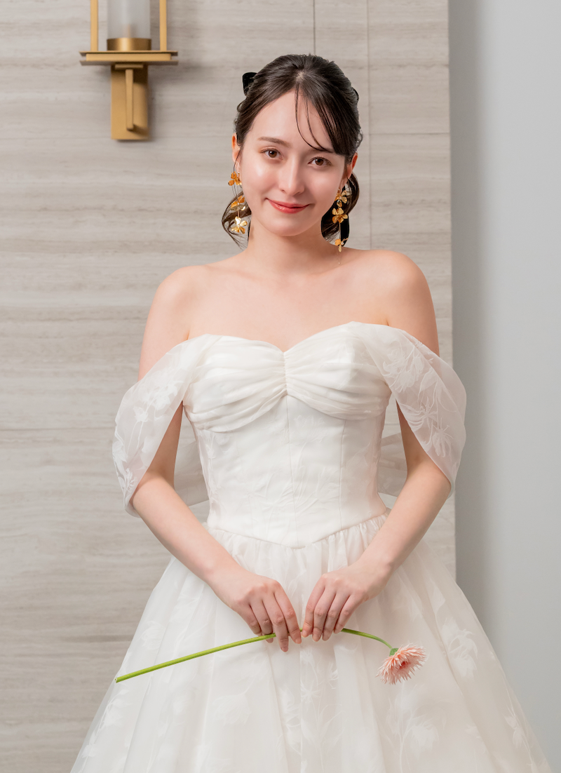 繊細な花柄のフロッキーオーガンジーを贅沢に用い、透明感のある柔らかな表情を描き出すウエディングドレス。爽やかな海風に舞うような質感が、動きに合わせてやさしく揺らぎ、上品な余韻をもたらします。
