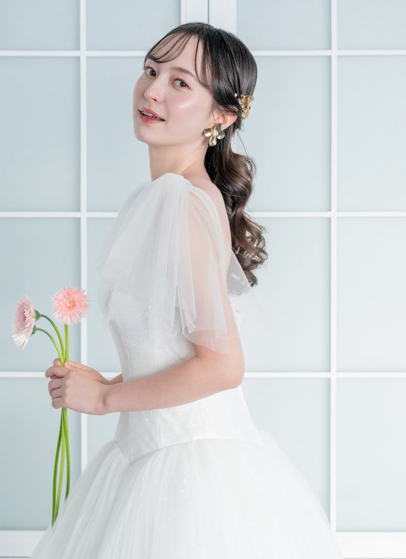 繊細なプリーツチュールに、きらめきを宿すグリッターチュールを配することで、奥行きのある華やかなボリュームを表現した一着。空気をふくんだような軽やかさとともに、動くたびにやわらかな揺らぎが生まれ、光を受けて上品に輝きます。