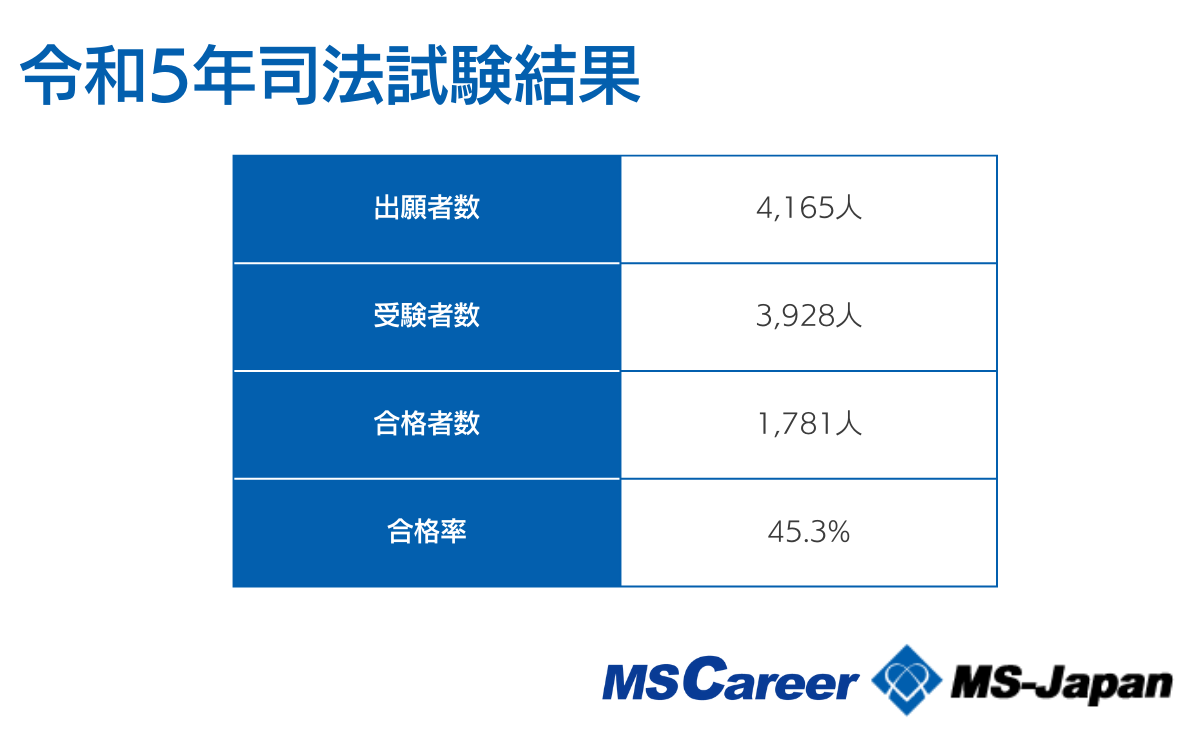 令和5年試験の司法試験の最終合格率については45.3%でした。