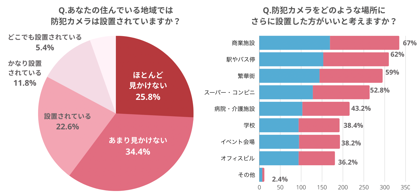 また、防犯カメラの設置を増やした方がいいと考える場所に対して、最も回答数が多かったのは「商業施設(67.0%)」ついで「駅やバス停(62.0%)」と全体の6割以上が回答しました。