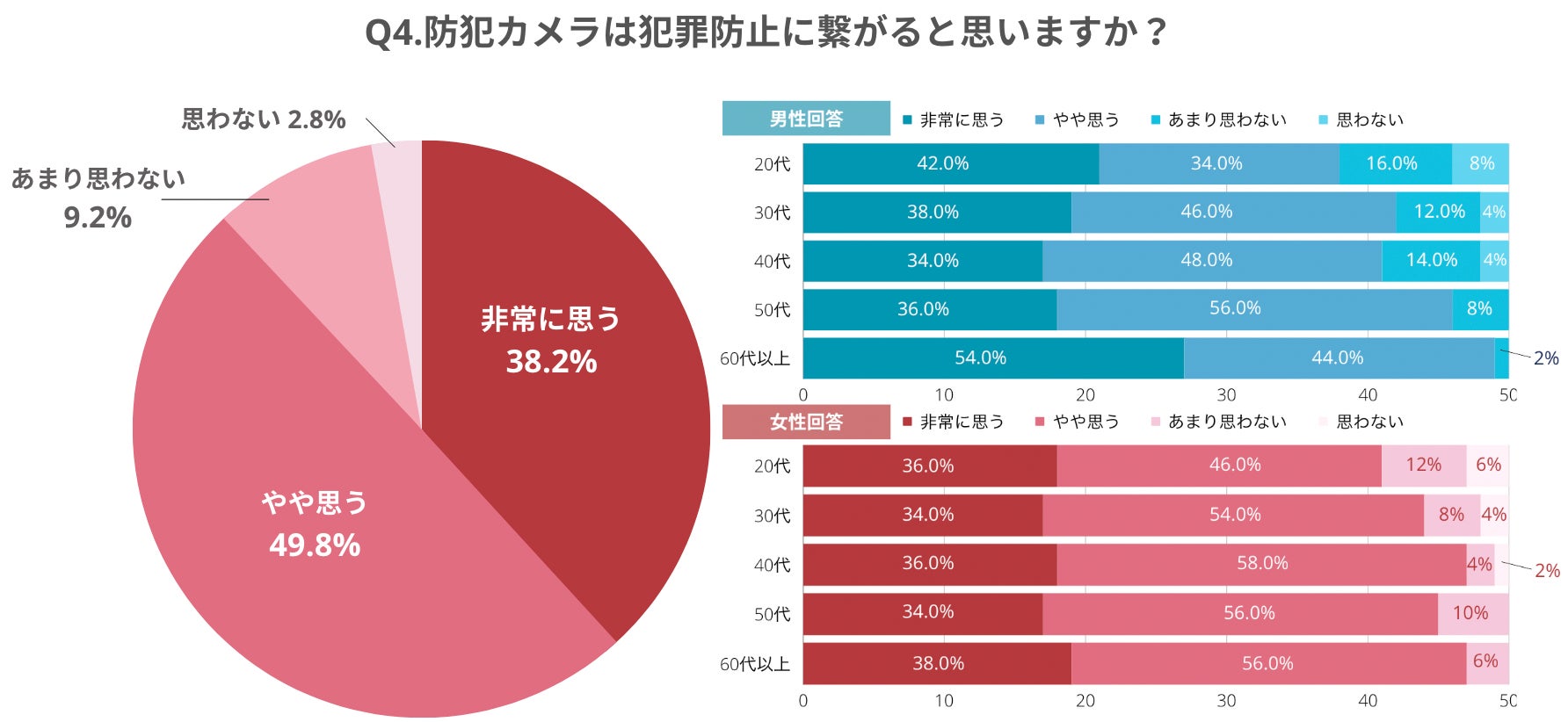 「防犯カメラは犯罪抑止に繋がると思いますか」という質問に対し、全体の88.0%が「(犯罪抑止に)非常に繋がる(38.2%)」「やや思う(49.8%)」と回答し、男女ともに防犯カメラへの犯罪抑止の期待は高い傾向にあることが分かりました。