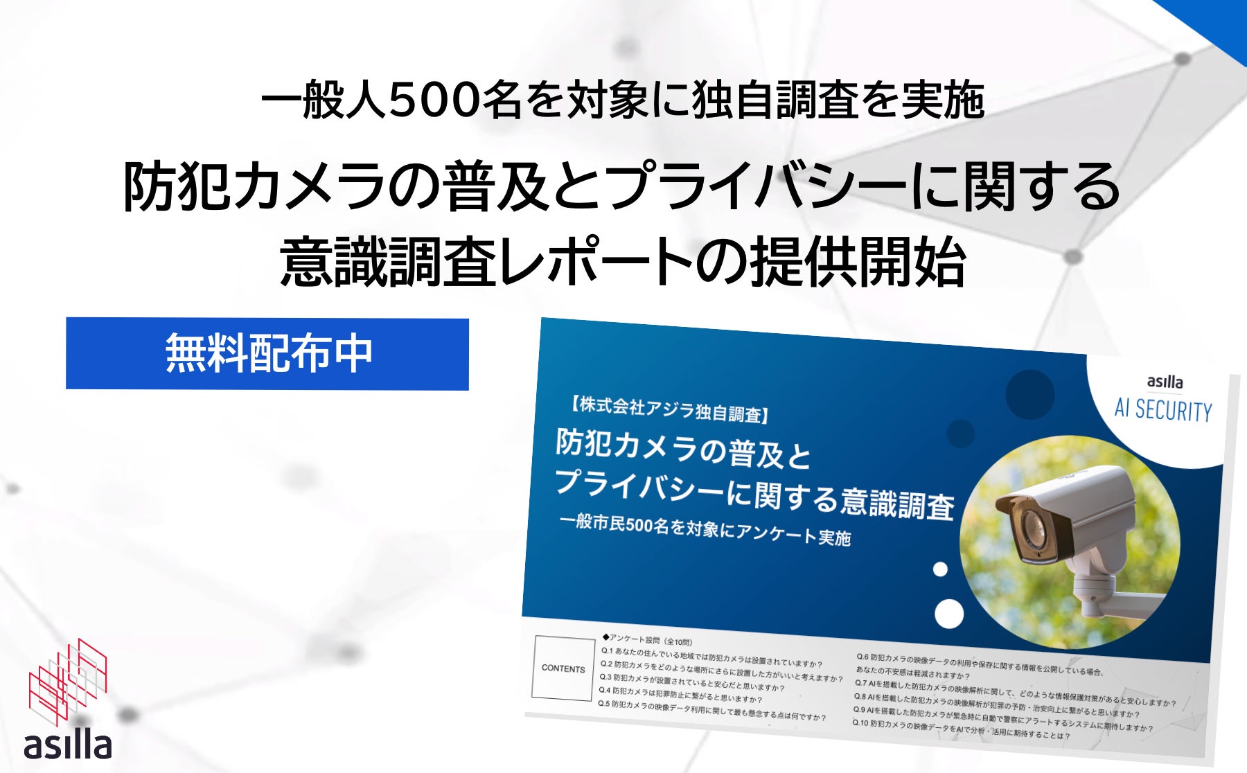 このような防犯カメラの広がりとこれに伴う問題点に対して、一般の人々はどのような認識を持っているのでしょうか。市民の意識や要望を把握し、将来的なセキュリティのさらなる向上に役立てることを目的として、アジラは「防犯カメラの普及とプライバシー保護に関する意識調査」を実施しました。このプレスリリースでは、その調査結果の一部を公表いたします。