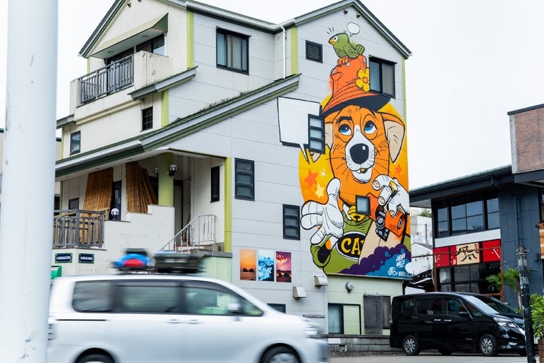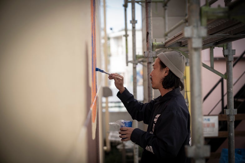 また、Dragon76 氏とほど近い場所で制作した同じく大阪美術専門学校卒業生のCAB氏は、海辺の風景に映えるビビッドな色彩と、ユニークな表情のキャラクターを描写。地域の住民とのふれあいからキャラクターの表情を発想するなど、制作プロセスにも温かみが感じられました。