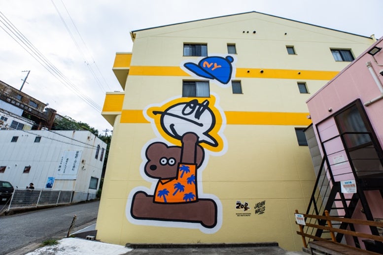 本プロジェクトで2人が挑んだのは、白浜町・柳橋通り近くの集合住宅の大きな壁面。松本氏が2023年に描いたキャラクター「ねずみのANDY」と、中山氏が2024年に制作した「PonZ」が同じ世界で遊ぶように描かれています。白浜らしい海風を感じるビジュアルとして、日焼けした「ねずみのANDY」はオレンジのアロハシャツを、「PonZ」はNYメッツを思わせるカラーリングのキャップを身につけ、2人の個性が自然に溶け合う構成となりました。