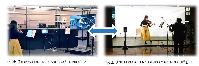 今回の実験は、ヴァイオリニストの澤和樹(さわ かずき)先生と、吉川采花(よしかわ あやか)氏による遠隔レッスン形式で実施。凸版印刷株式会社(以下、「凸版印刷」)の「TOPPAN DIGITAL SANDBOX🄬 HONJO※2」(東京都墨田区)と「NIPPON GALLERY TABIDO MARUNOUCHI🄬 ※3」(東京都千代田区)を、株式会社ブロードバンドタワー(以下、「ブロードバンドタワー」)の専用ネットワーク回線で接続し、当社とヤマハの共同開発による低遅延伝送装置を介して、離れた2拠点間の映像と音声を双方向に伝送しました。「NIPPON GALLERY TABIDO MARUNOUCHI🄬」では、大画面モニターに遠隔の生徒を等身大で映し出し、臨場感ある体験を提供しました。