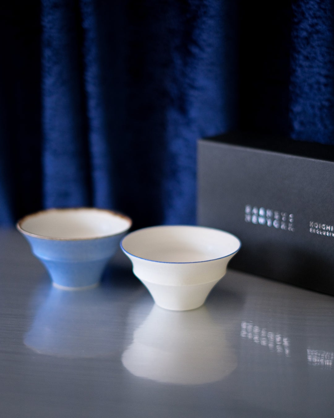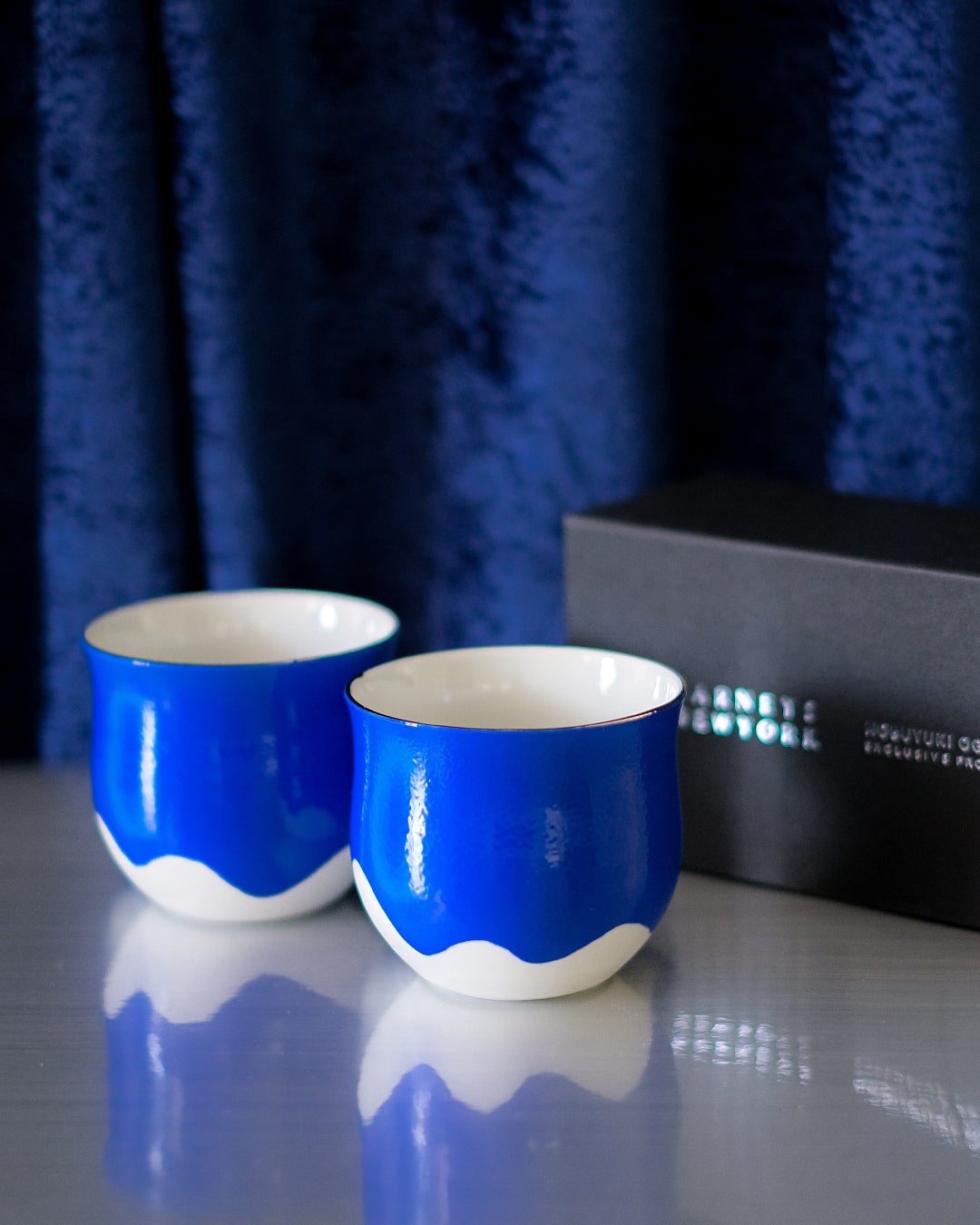 <獺祭BLUE>は日本とアメリカの山田錦を使用しながら、日本で造られる<獺祭>よりアルコール度数を1度ほど下げてワインに近い14度で造られており、欧米市場を意識したすっきりとしたクリアな味わいが魅力です。今回はバーニーズ ニューヨークとのコラボレーションとして、<獺祭BLUE>がバーニーズ ニューヨーク限定のオリジナルボックスに入り、本企画に相応しい2名の陶芸作家による酒器2客付で販売します。