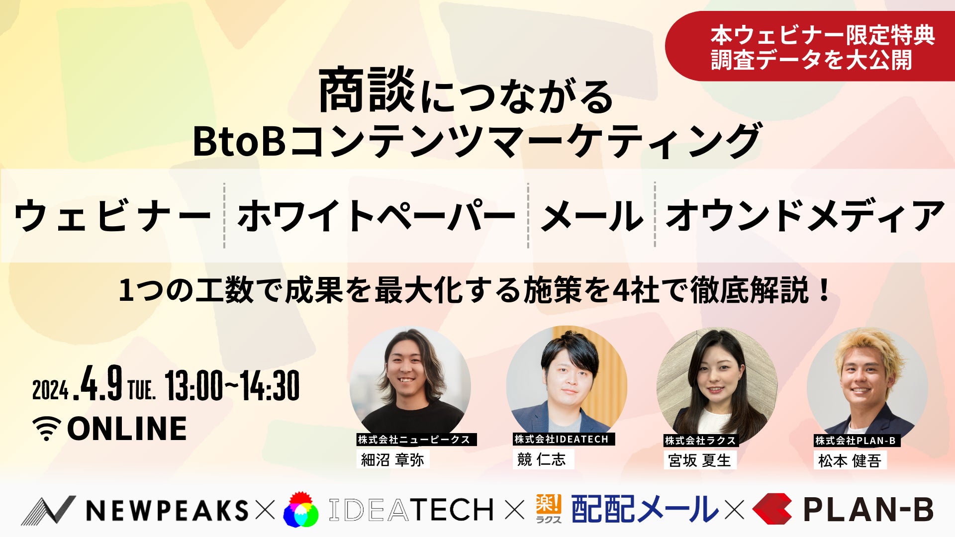 ファクトに基づいたコンテンツ開発とマーケティング支援を行う、株式会社IDEATECH(本社:東京都港区、代表取締役社長:石川友夫)は、株式会社ニューピークス(本社:東京都渋谷区、代表取締役:小林 慶嗣)と、株式会社ラクス(本社:東京都渋谷区、代表取締役:中村崇則)と、株式会社PLAN-B(本社:東京都品川区と、代表取締役社長:鳥居本 真徳)と共同で、2024年4月9日(火)13:00-14:30に「『商談』につながるBtoBコンテンツマーケティング|ウェビナー・ホワイトペーパー・メール・オウンドメディア、1つの工数で成果を最大化する施策を4社で徹底解説」と題するオンラインセミナーを開催いたしますので、お知らせいたします。