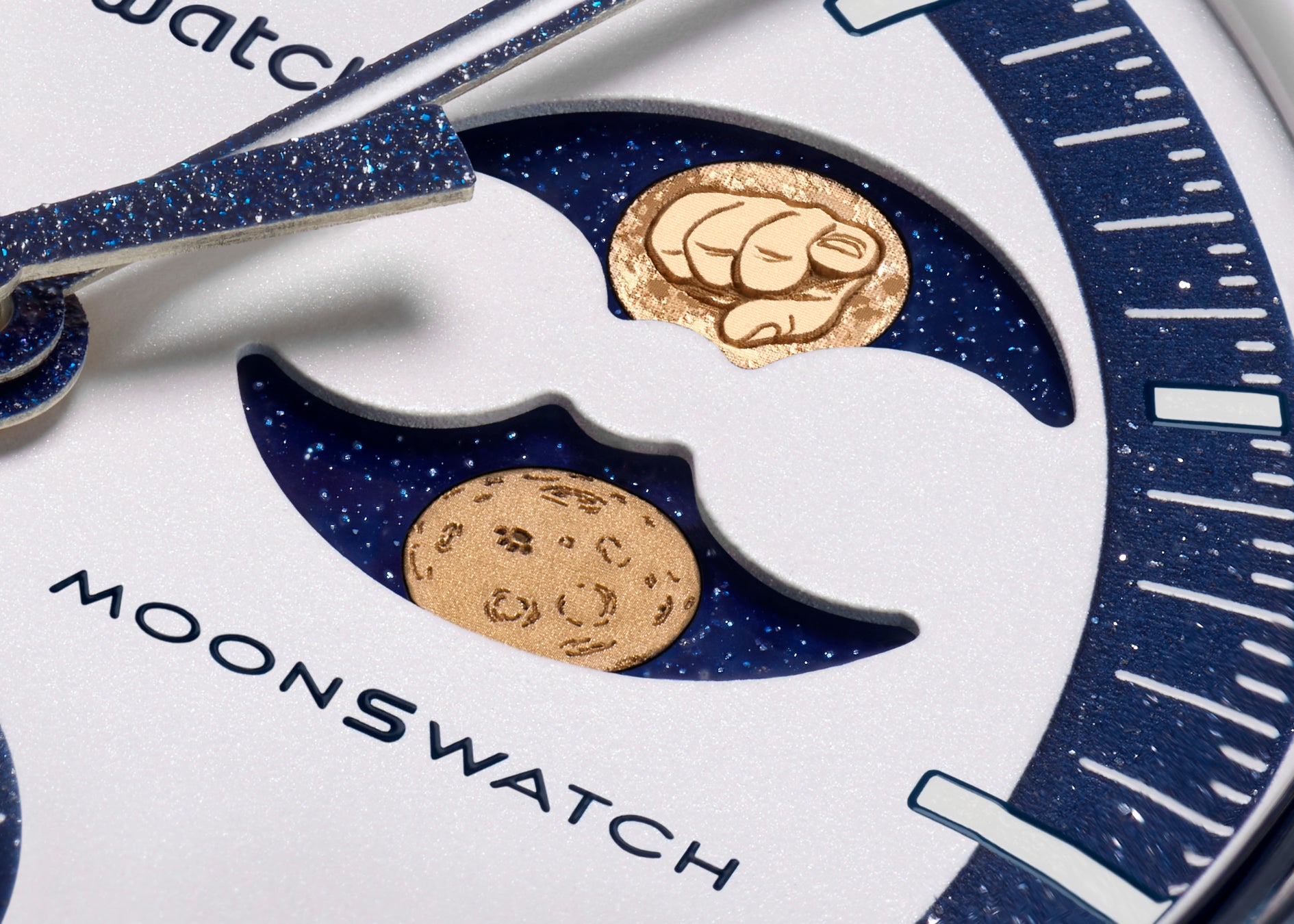 視覚的には、この新作タイムピースは前作のモデルを忠実に再現した文字盤のレイアウトを継承し、Swatchの最新のイノベーションであるアースフェイズ、OMEGAのMoonshine™ Goldをあしらったムーンフェイズ表示、そしてSnoopyワールドのイラストで仕上がっています。